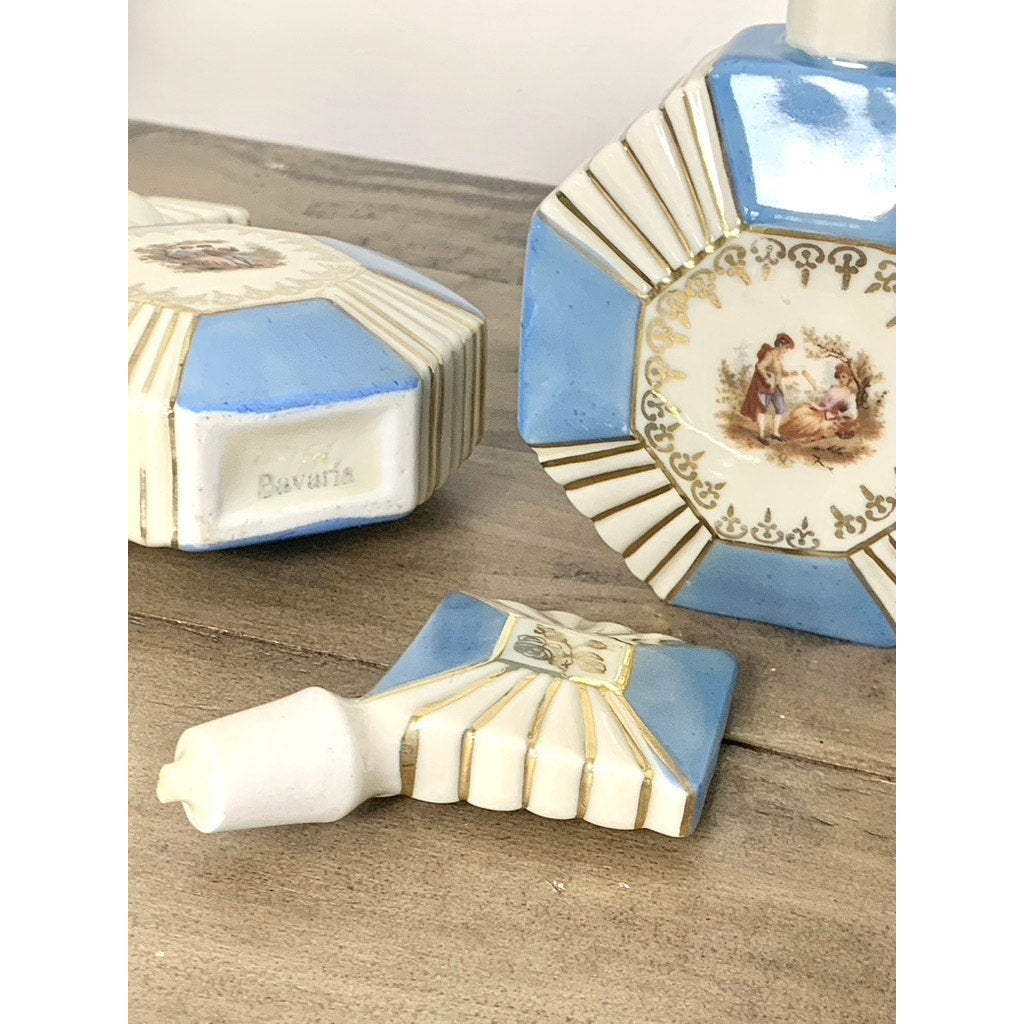 Antique Bavaria Porcelain Perfume Bottles Set of 2 Blue Gold Courting Scene Vintage Vanity Edwardian Art Deco Regency