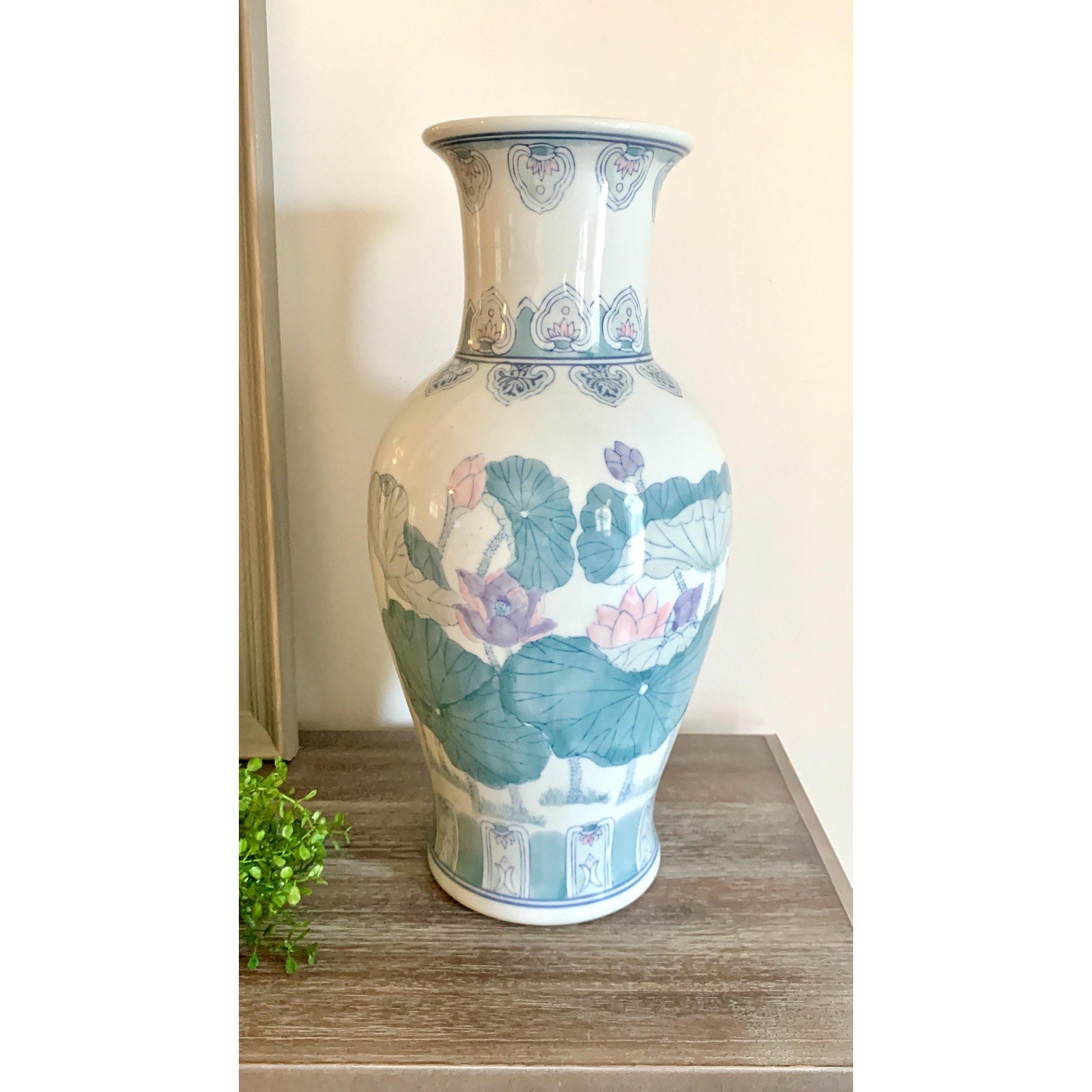 This stunning large vintage Chinoiserie vase features a beautifully hand-painted design in soft pastel tones. Delicate lotus flowers and lush green leaves wrap around the porcelain, creating a serene and elegant look. Perfect as a statement piece for any room, this vase adds timeless charm to traditional, eclectic, or modern decor.