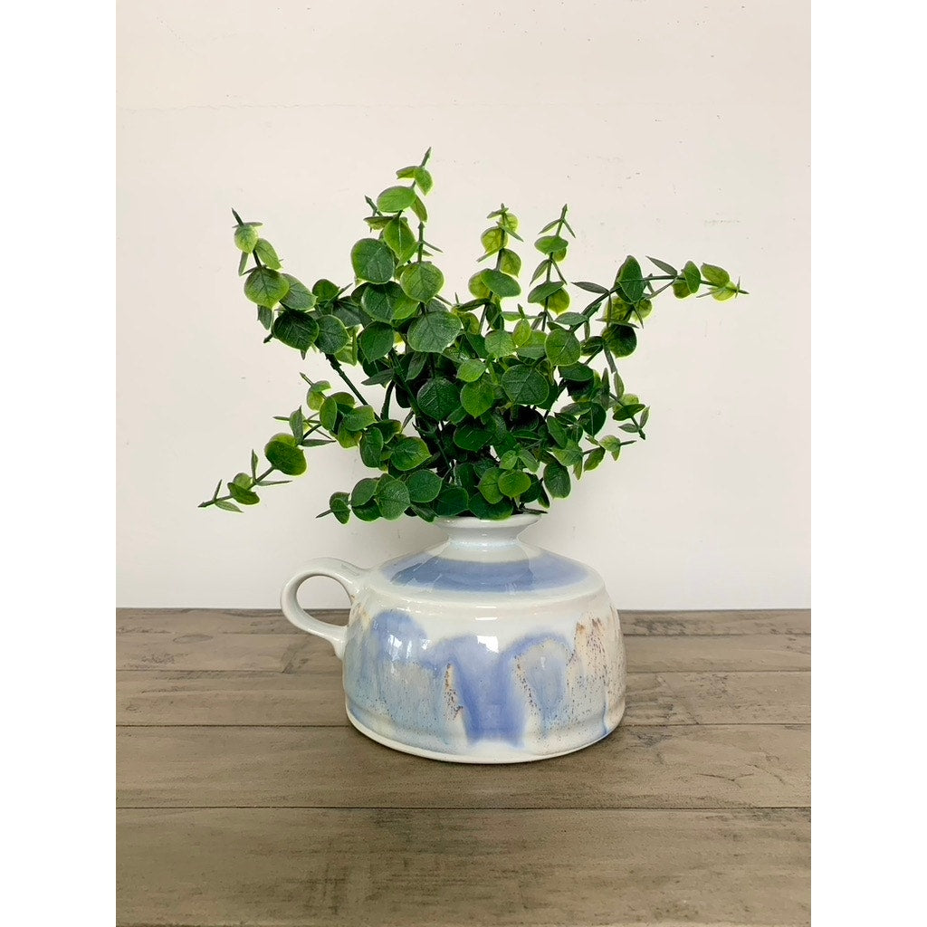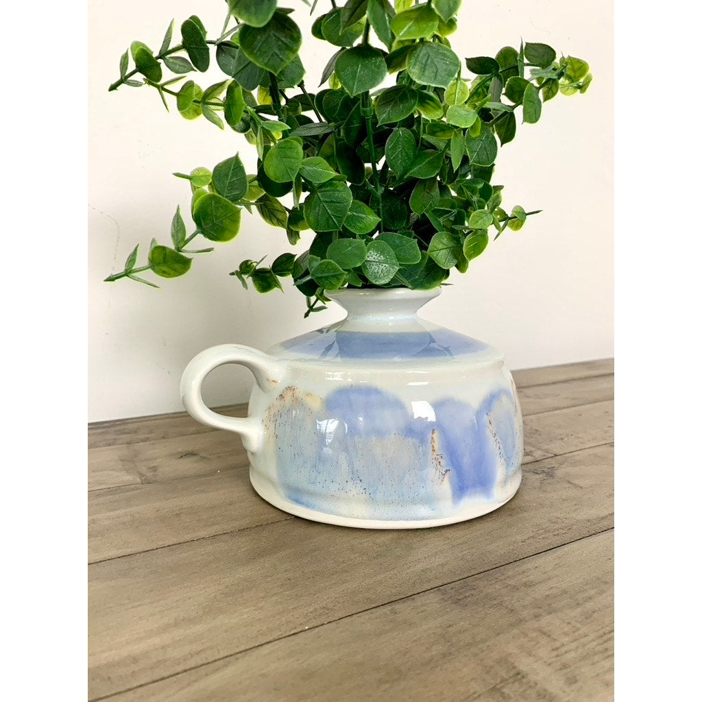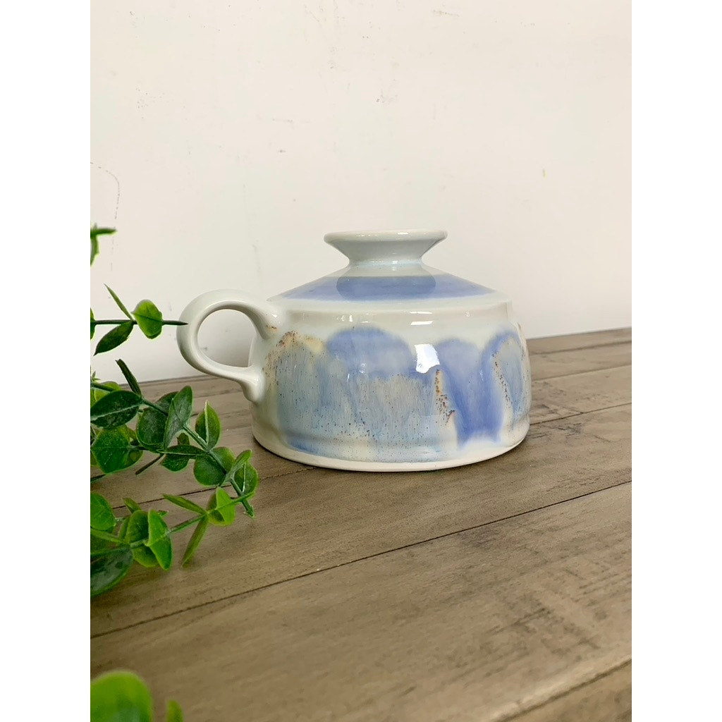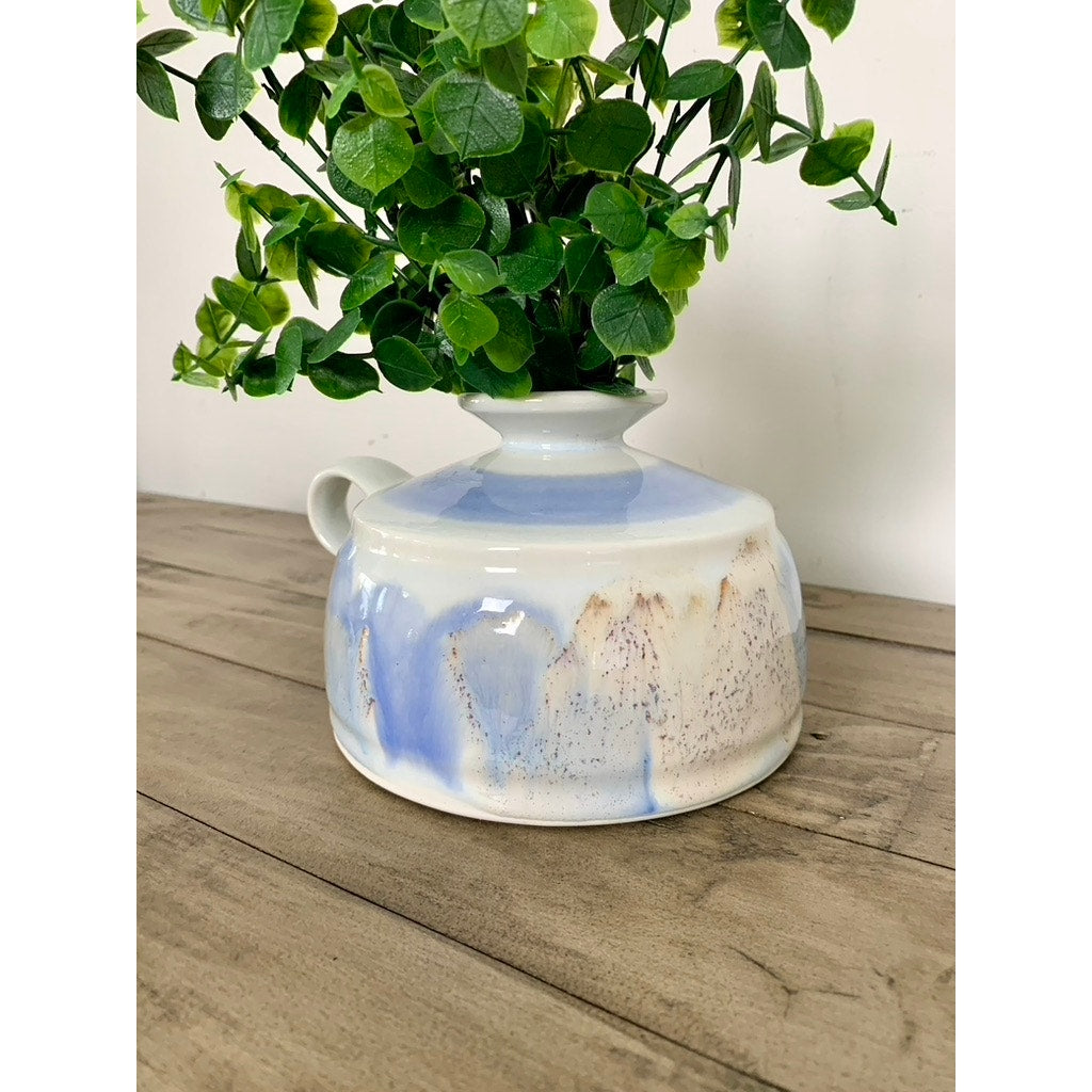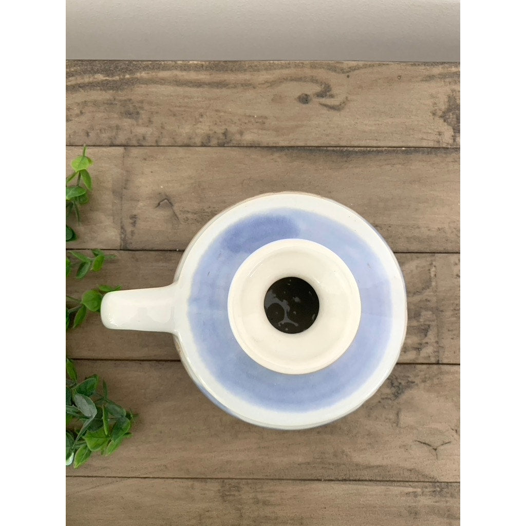 This beautiful Kravec Studios art pottery piece showcases a soft, flowing glaze in calming shades of blue, white, and earthy tones. The versatile shape allows it to be used as a vase, oil lamp, or candleholder, making it a functional and decorative piece.