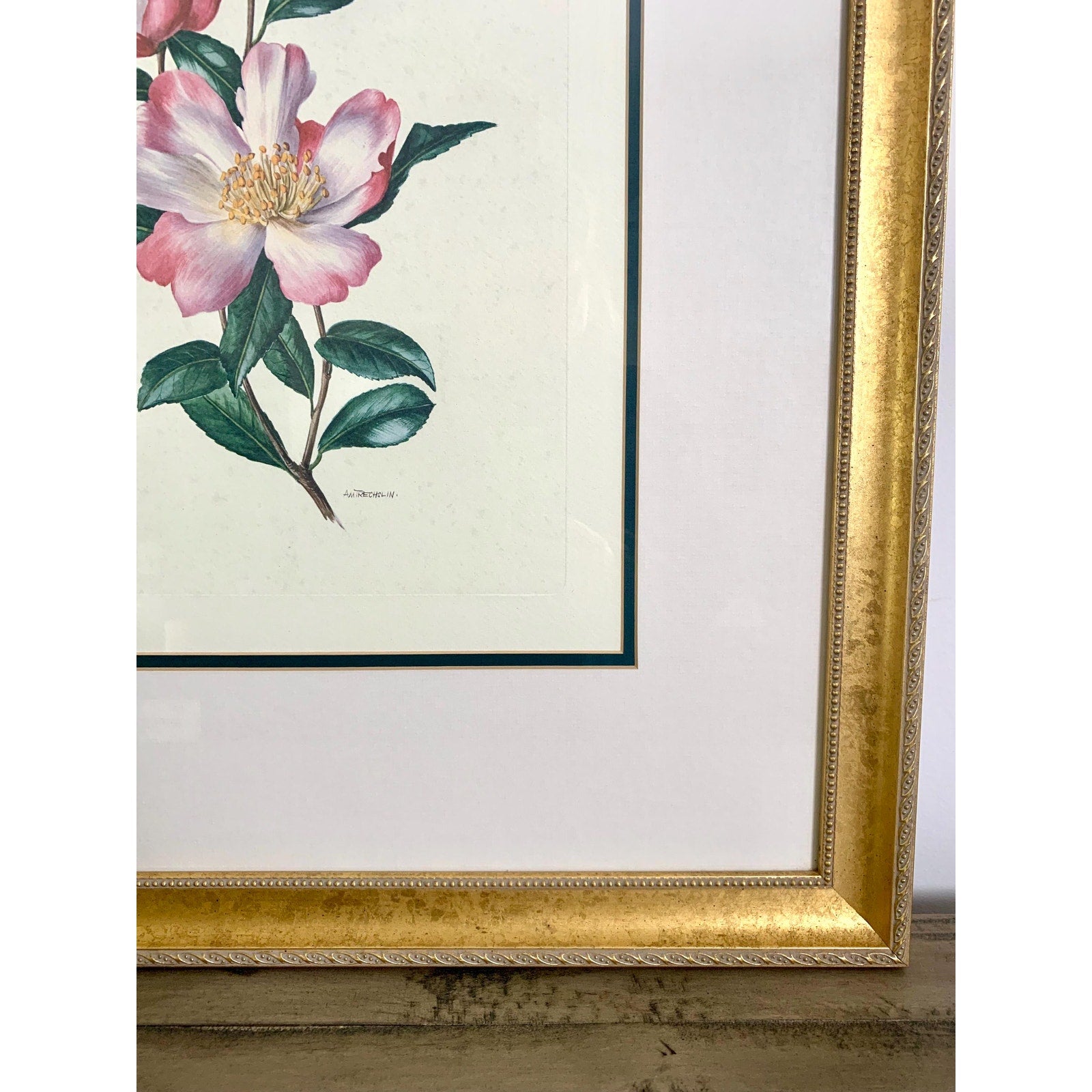 Large Vintage Floral Lithograph Signed by Ann Trechslin, Framed and Matted