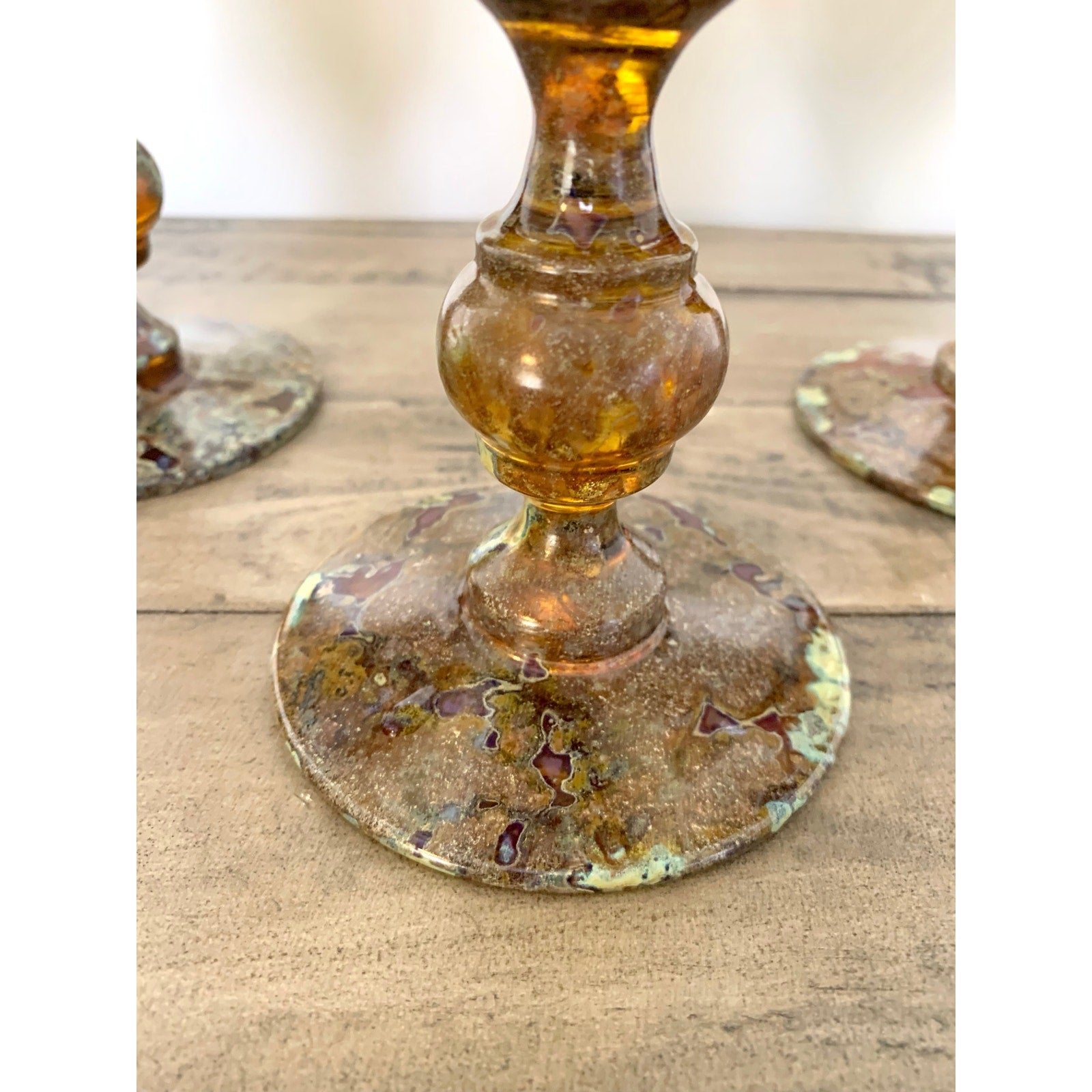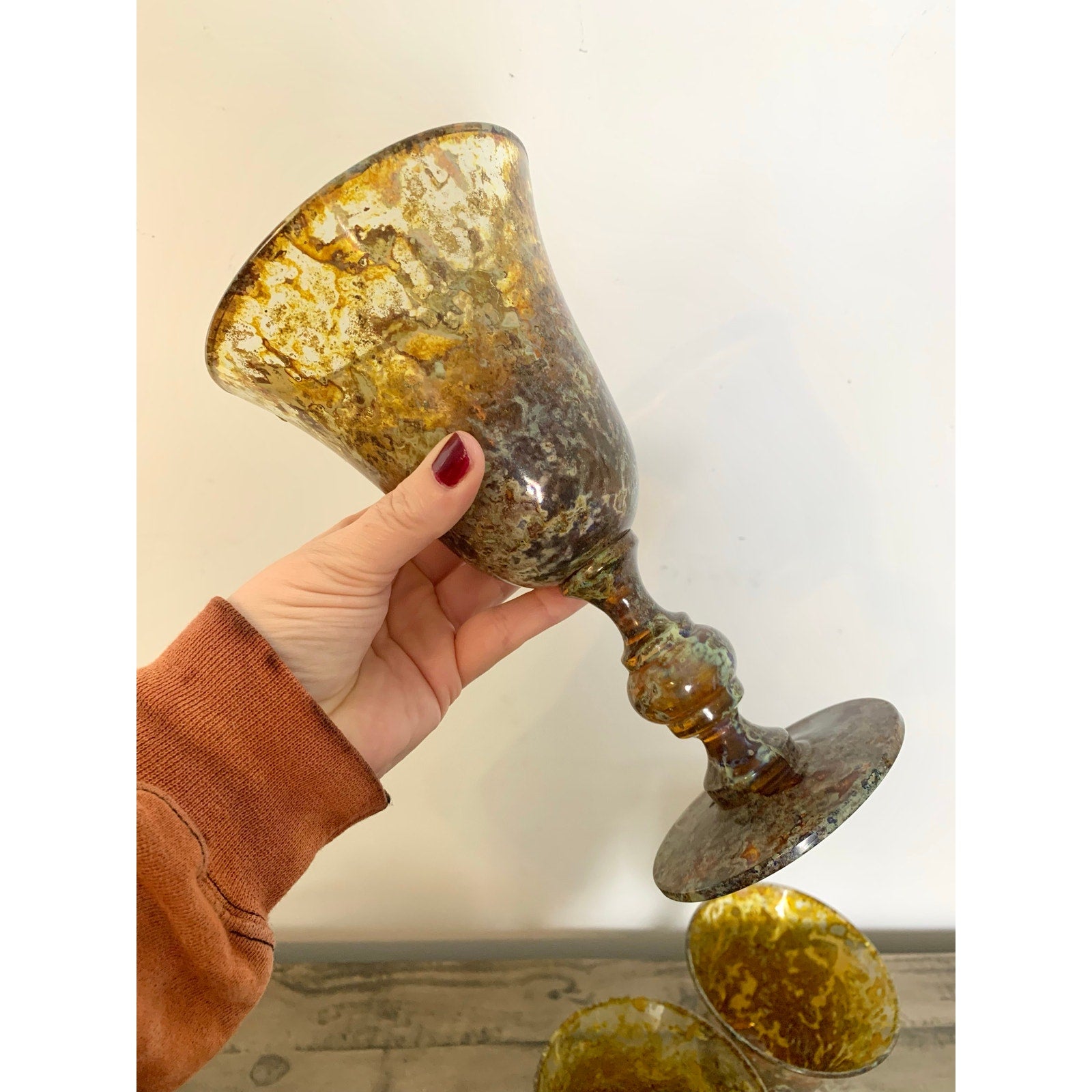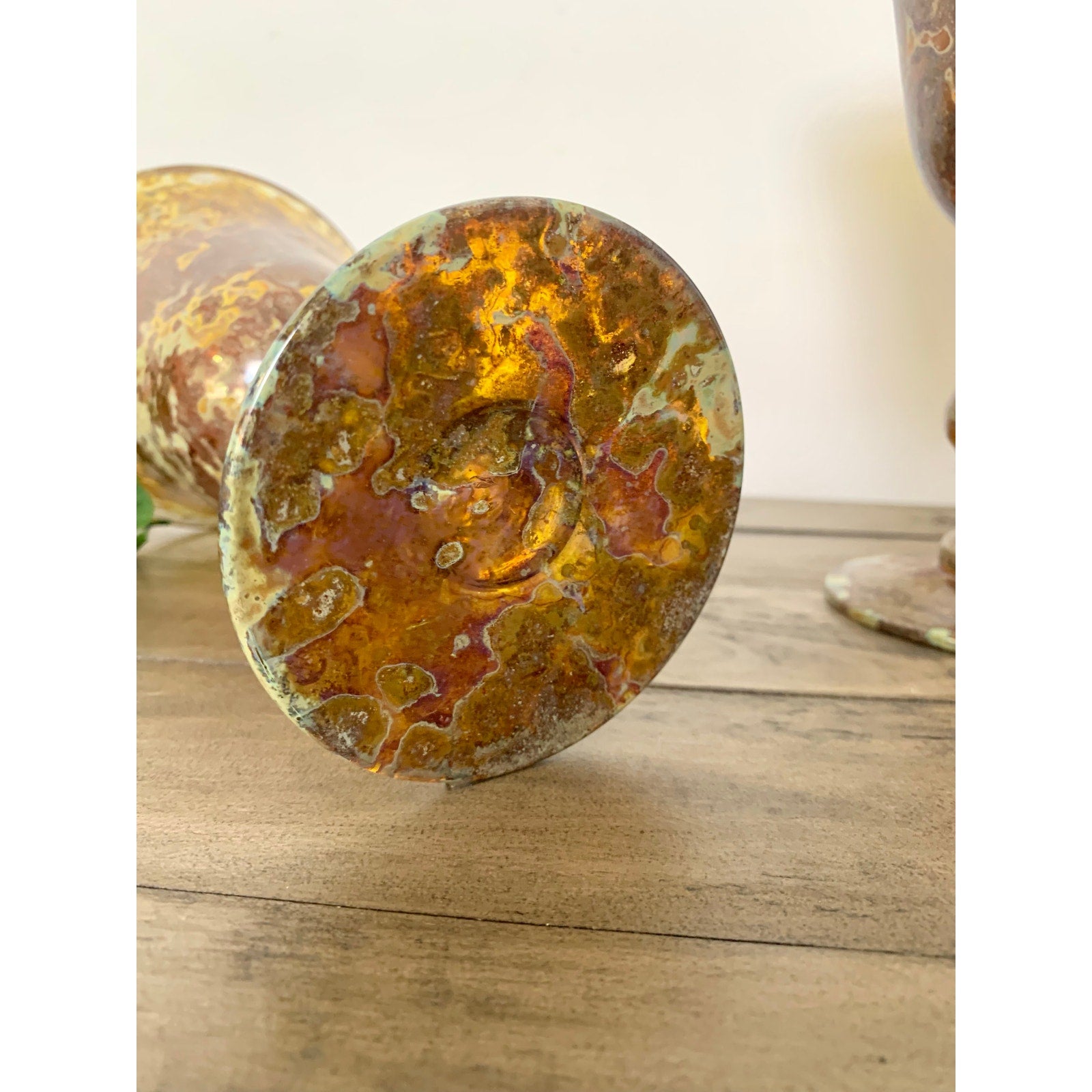 This exquisite set of three vintage Neiman Marcus goblets features a striking red moss agate pattern — a richly marbled combination of amber, rust, and mossy green tones that give each glass a unique, organic appearance. Hand-blown in Poland, these art glass pieces showcase elegant flared rims and shapely stems with subtle variations that speak to their artisan craftsmanship. Absolutely stunning collectibles.