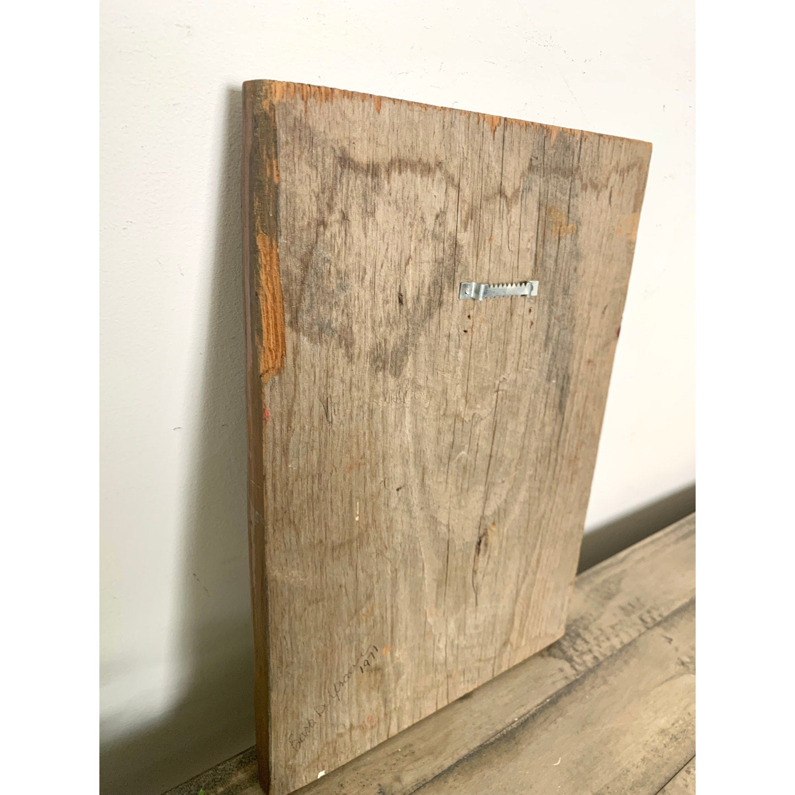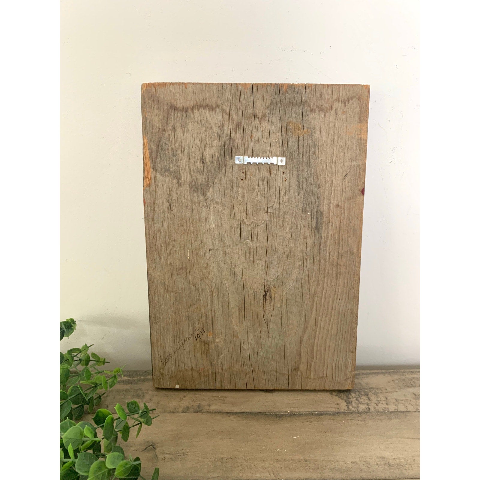 Charming vintage 1971 hand-painted artwork on rustic wood, signed on the back by the artist. This piece features a vibrant basket of apples with additional apples around the base, painted in warm, rich tones on aged barn wood. The natural cracks and texture of the wood add to its rustic farmhouse character, making it a one-of-a-kind piece of wall décor. A metal hanger is attached to the back for easy display. Perfect for farmhouse kitchens, rustic cabins, or anyone who appreciates vintage folk art.
