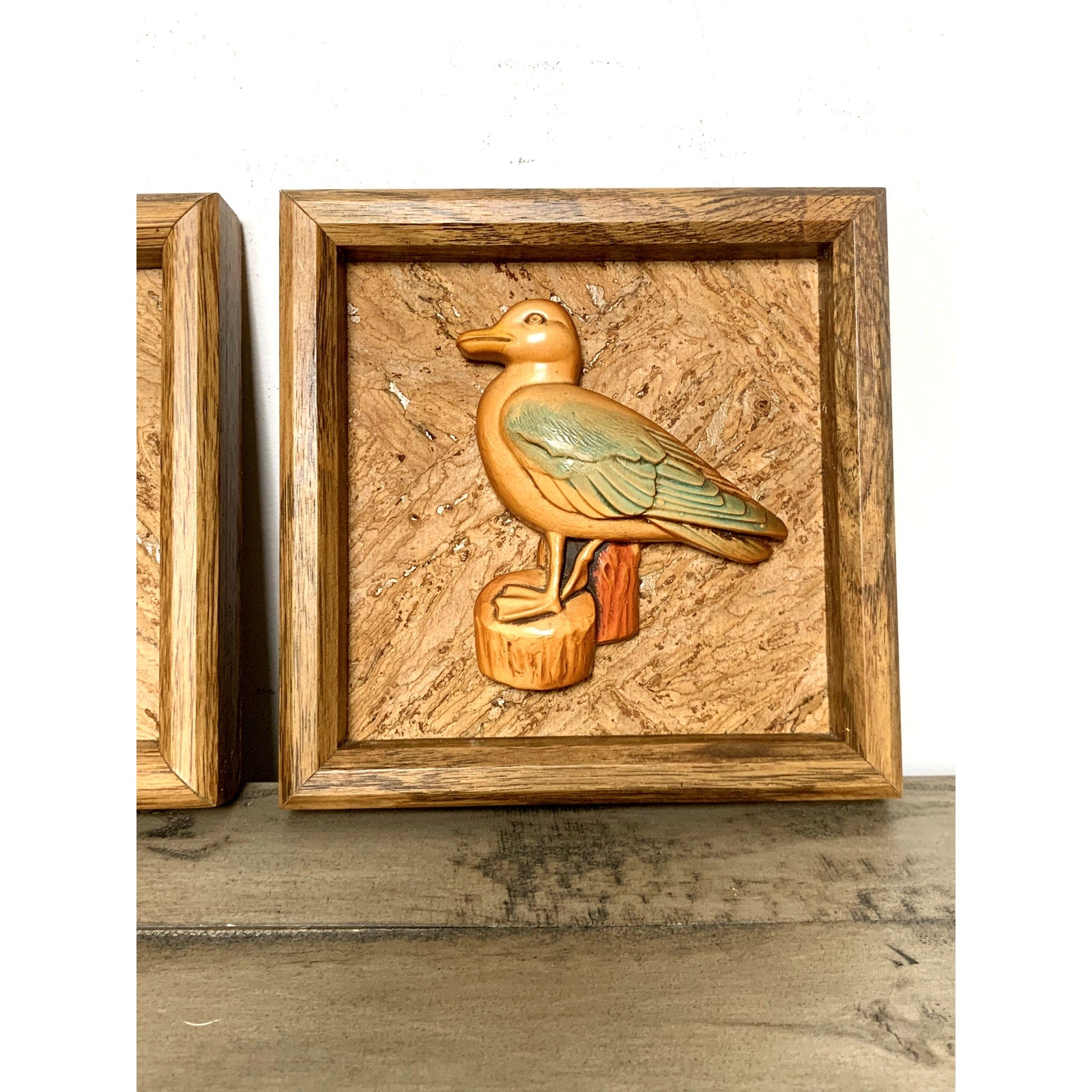 Pair of vintage 1982 Miller Studio 3D chalkware wall plaques featuring charming shorebird designs in warm orange and green tones. Each bird is mounted against a cork-like textured background, framed in wood, and ready to hang with attached hardware.