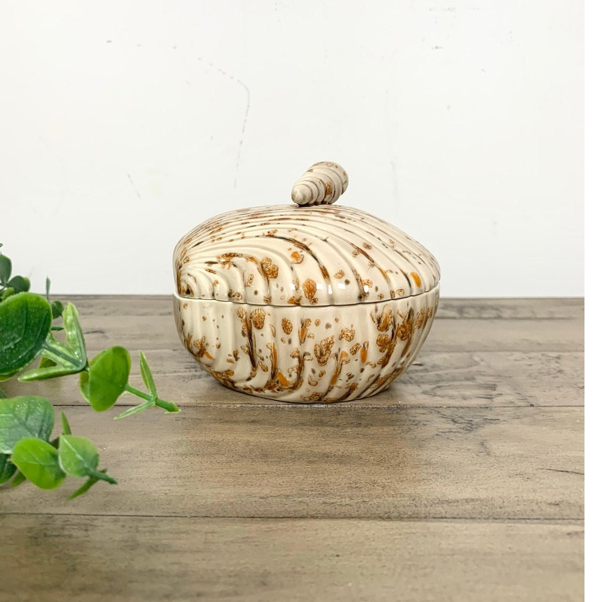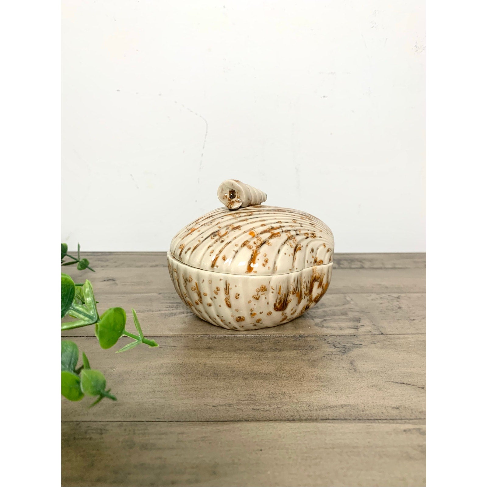 Charming vintage Scioto Ceramics lidded trinket dish, dated 1982 and shaped like a clam shell with a spiral shell top. The ceramic dish is finished in a glossy cream glaze with brown accents, mimicking the look of a real shell. Interior is more peach/nude.