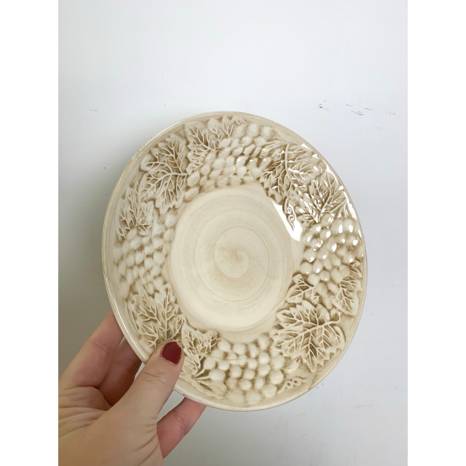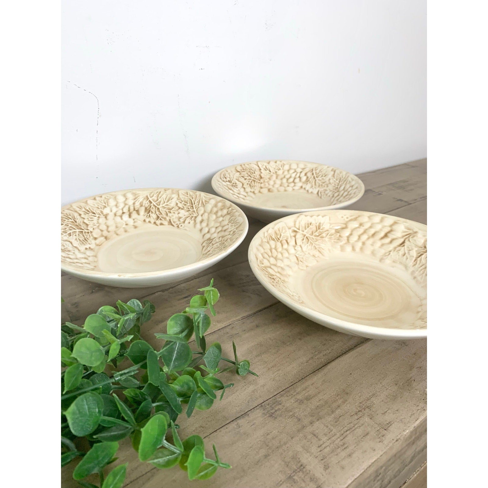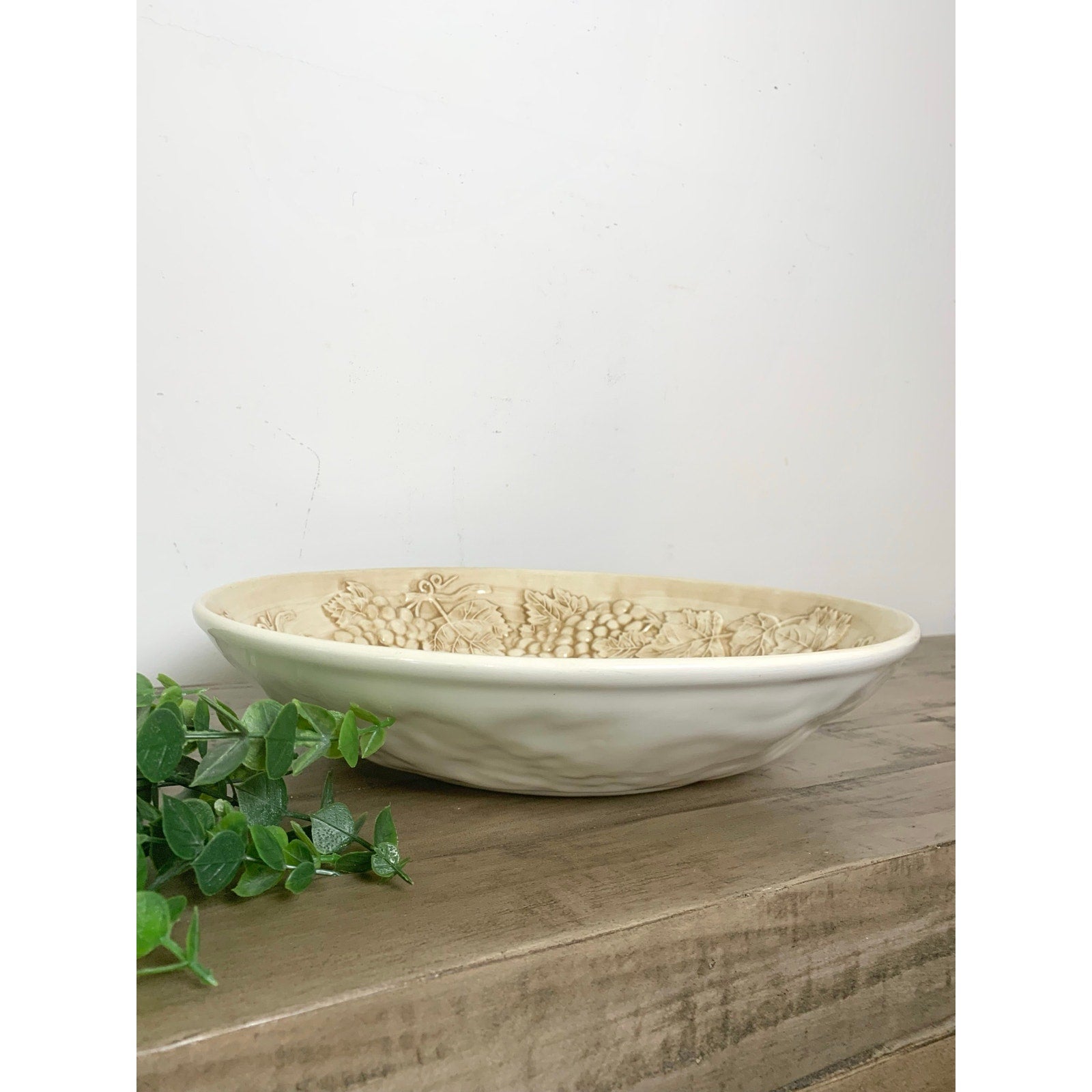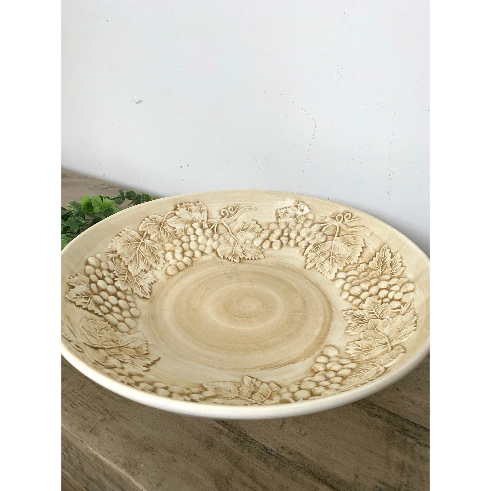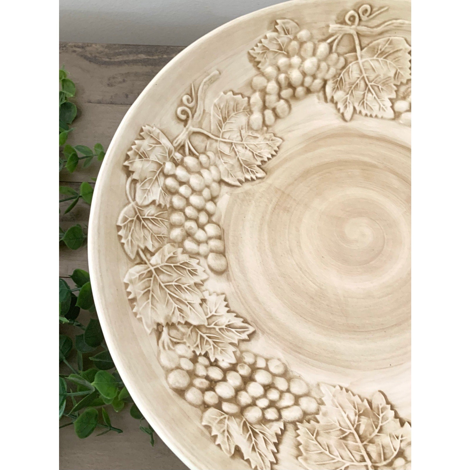 The large bowl is perfect for salads, pasta, or as a centerpiece, while the smaller bowls are ideal for fruit, side dishes, smaller pasta servings, or salad. The neutral creamy beige color with raised grapevine detailing makes this set versatile for rustic farmhouse, Mediterranean, or classic dining décor.