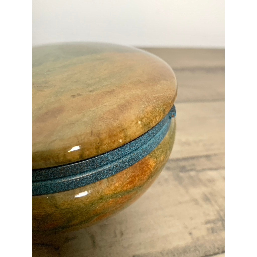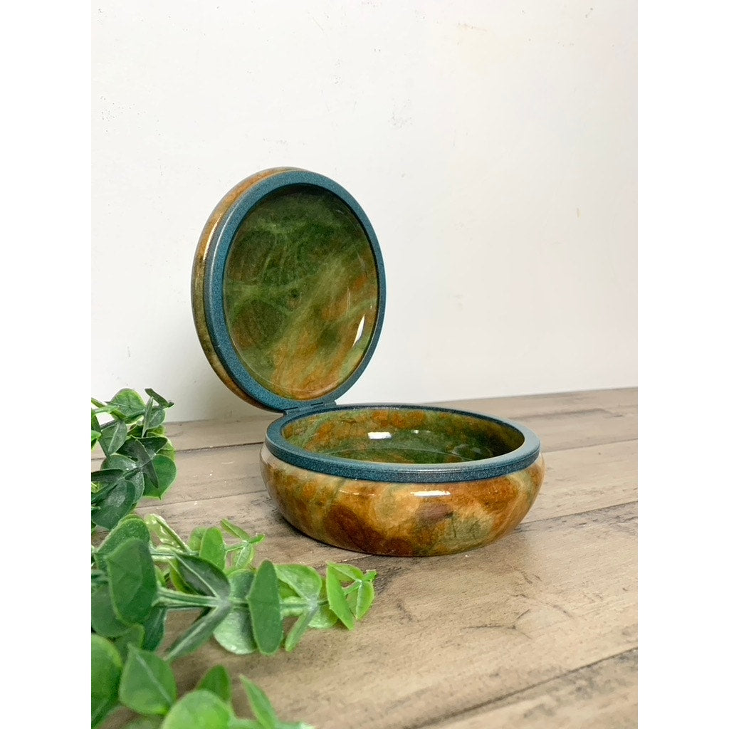 Beautiful genuine alabaster box with a hinged lid, featuring earthy green and caramel brown veining and a smooth polished finish. This round trinket box is both functional and decorative, perfect for storing jewelry, keepsakes, or as an accent piece for vanity and vintage-inspired decor. Compact yet substantial. Good condition with light surface wear from age and a few tiny chips see photos.