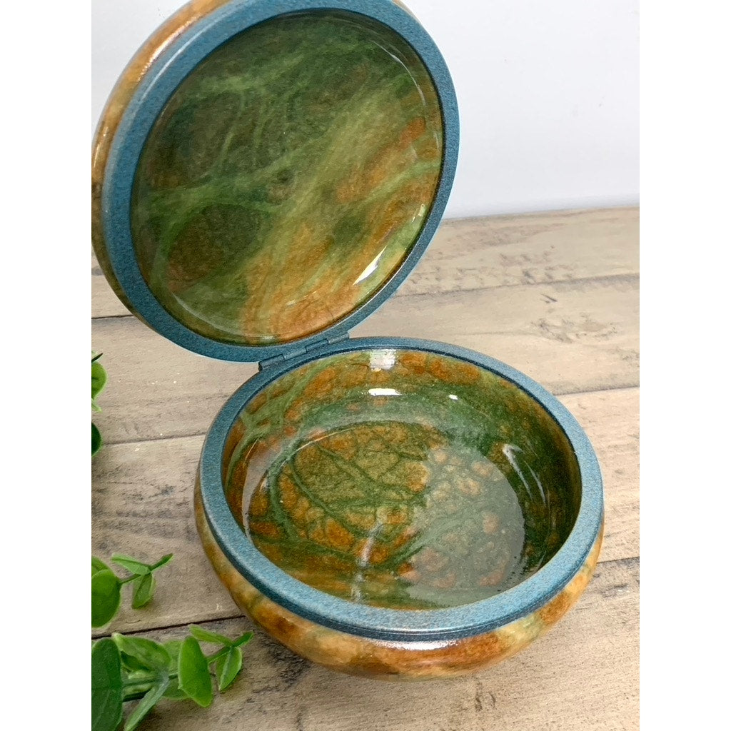Vintage Alabaster Trinket Jewelry Box Hinged Earthy Green Brown Veining Stone
