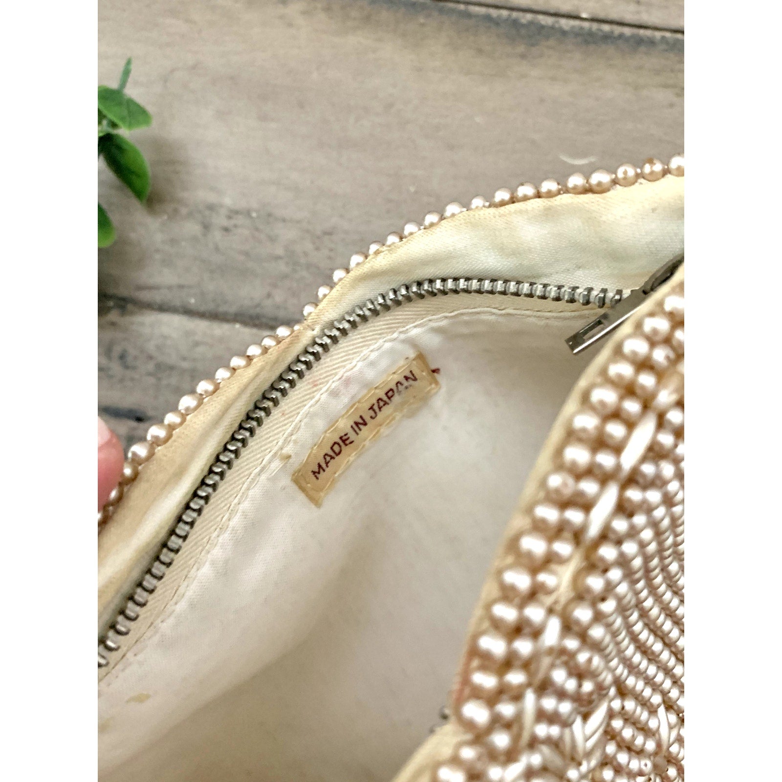 This stunning vintage evening bag is beautifully adorned with faux pearl beads in an elegant floral pattern. Featuring a wristlet strap and zip closure, this piece was made in Japan and exudes timeless style.