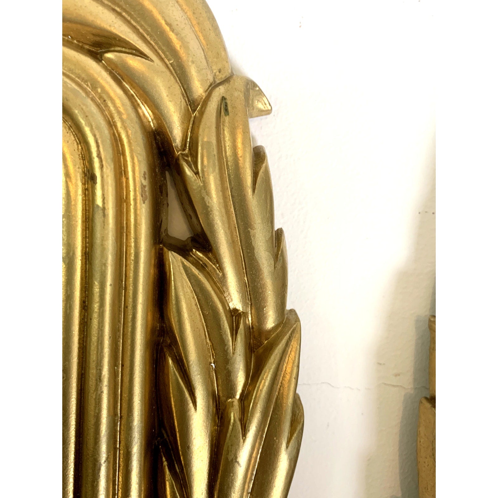 This stunning pair of vintage Burwood wall mirrors features intricate gold-tone laurel leaf frames and integrated single-arm candle sconces. The elongated mirrors reflect light beautifully, while the sculptural design adds elegance and drama to any wall. Perfect for Hollywood Regency, French Provincial, or traditional interiors, these statement pieces work well in entryways, dining rooms, or flanking a fireplace, piece of art, or bed.