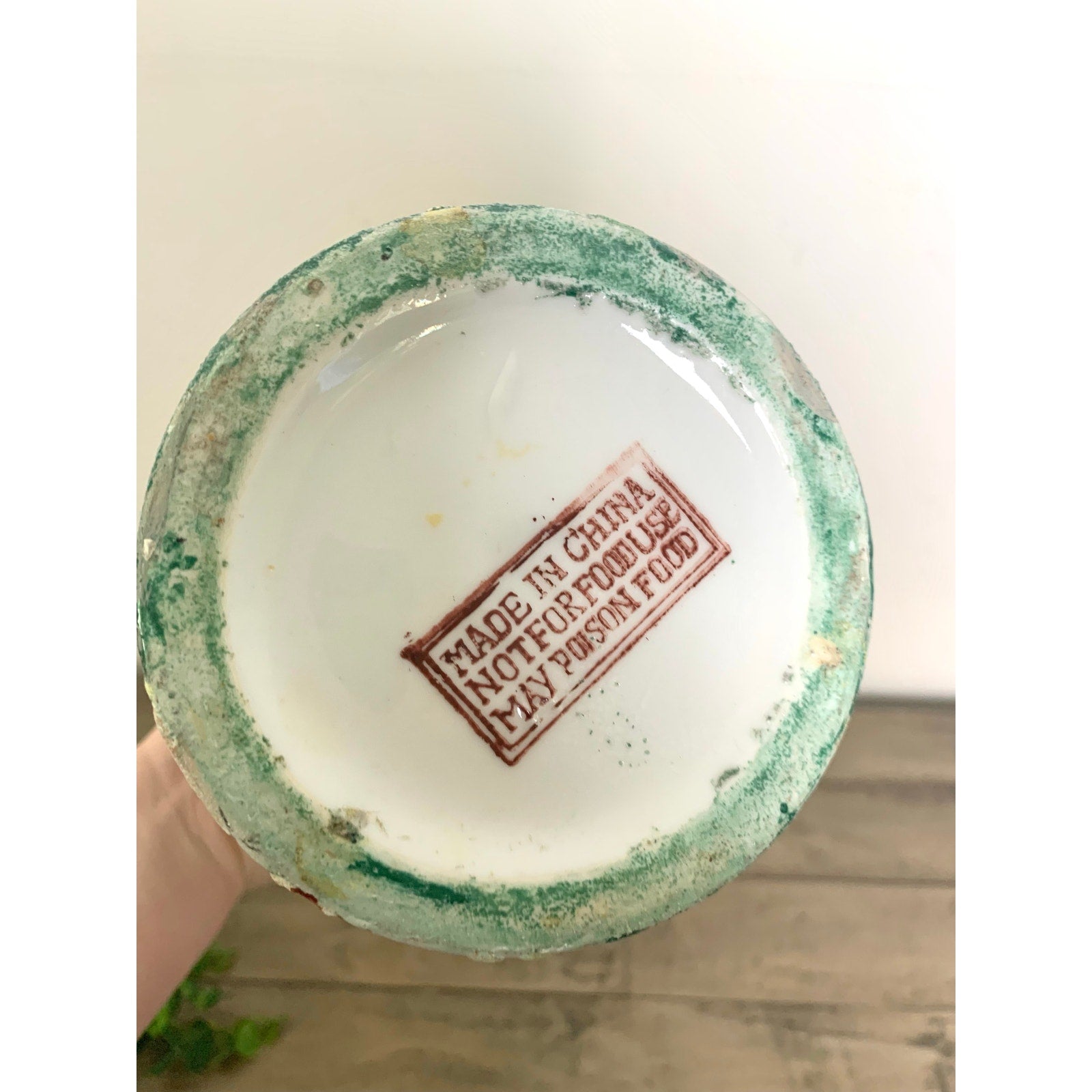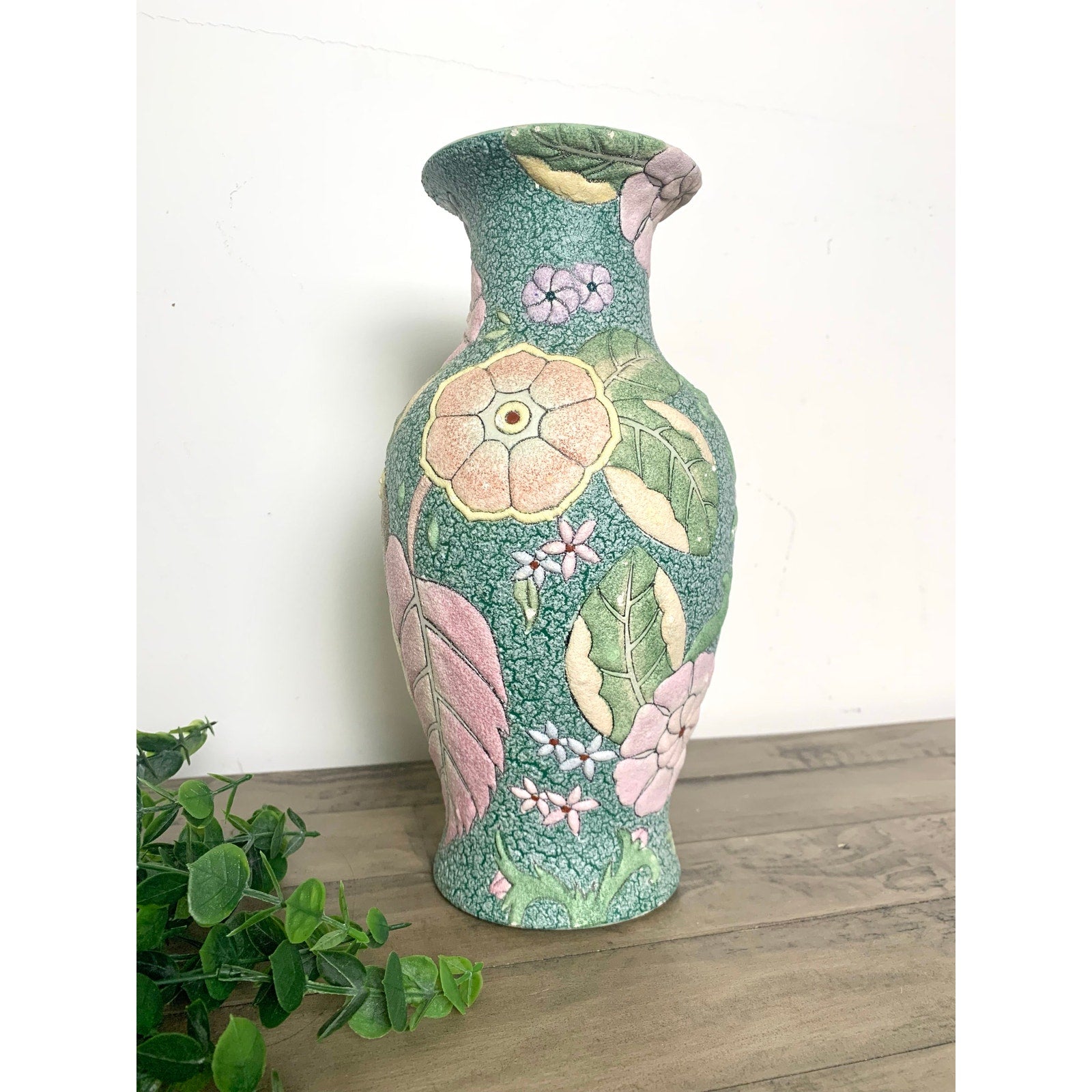This vintage Chinese ceramic vase features a stunning high-relief floral & fruit design with a lovely textured finish in green, lavender, and blush tones. The raised texture gives it beautiful dimension and visual interest, making it a perfect statement piece for a shelf, entryway, or table. Marked on the base and stamped “Not for food use"” it’s best used for display. There is some minor wear and small areas of texture loss—please refer to photos for details.