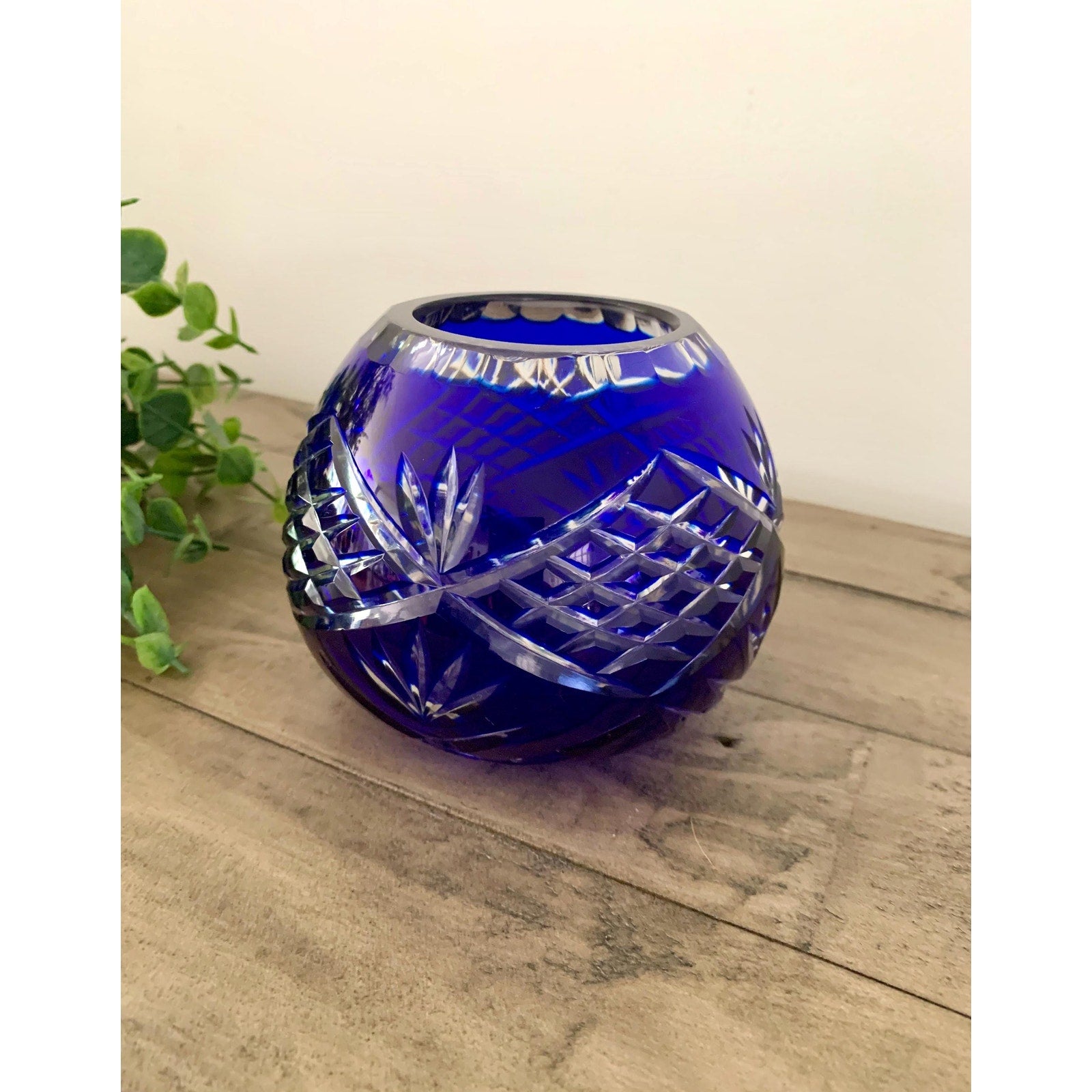 This exquisite vintage candle votive holder / crystal rose bowl features stunning cobalt blue cut-to-clear crystal with intricate geometric and floral patterns. The vibrant blue glass catches the light beautifully, adding an elegant glow to any space. A perfect accent piece for a dining table, mantle, or cozy corner.
