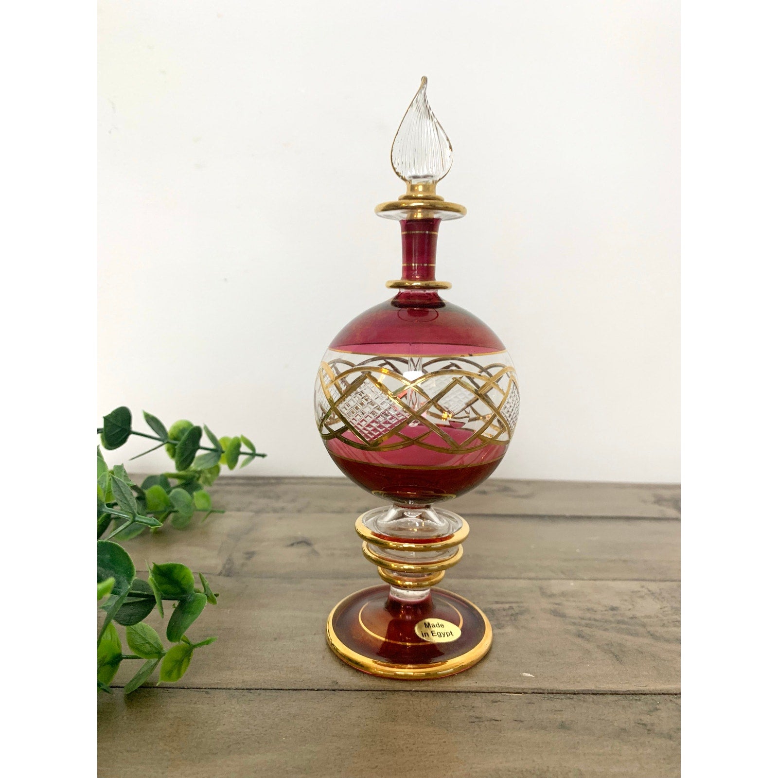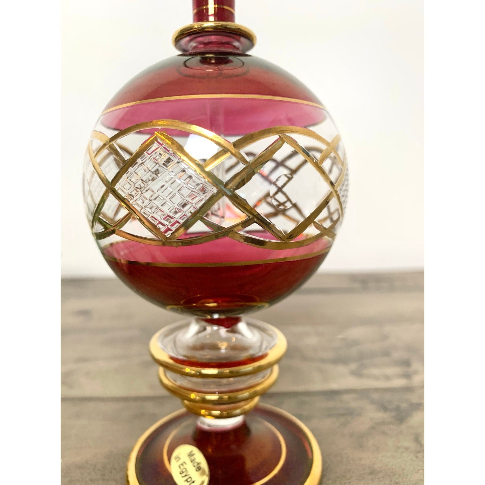 Hollywood Regency meets timeless elegance in this exquisite vintage Egyptian perfume bottle. Hand-blown ruby red glass with intricate cut glass panels is accented by hand-painted gold gilt lattice detailing and a clear teardrop stopper. A statement piece for any vanity or perfume collection, this ornate delicate design embodies classic Egyptian craftsmanship and mid-century glamour. Perfect for displaying on a mirrored tray or gifting to a vintage perfume lover.