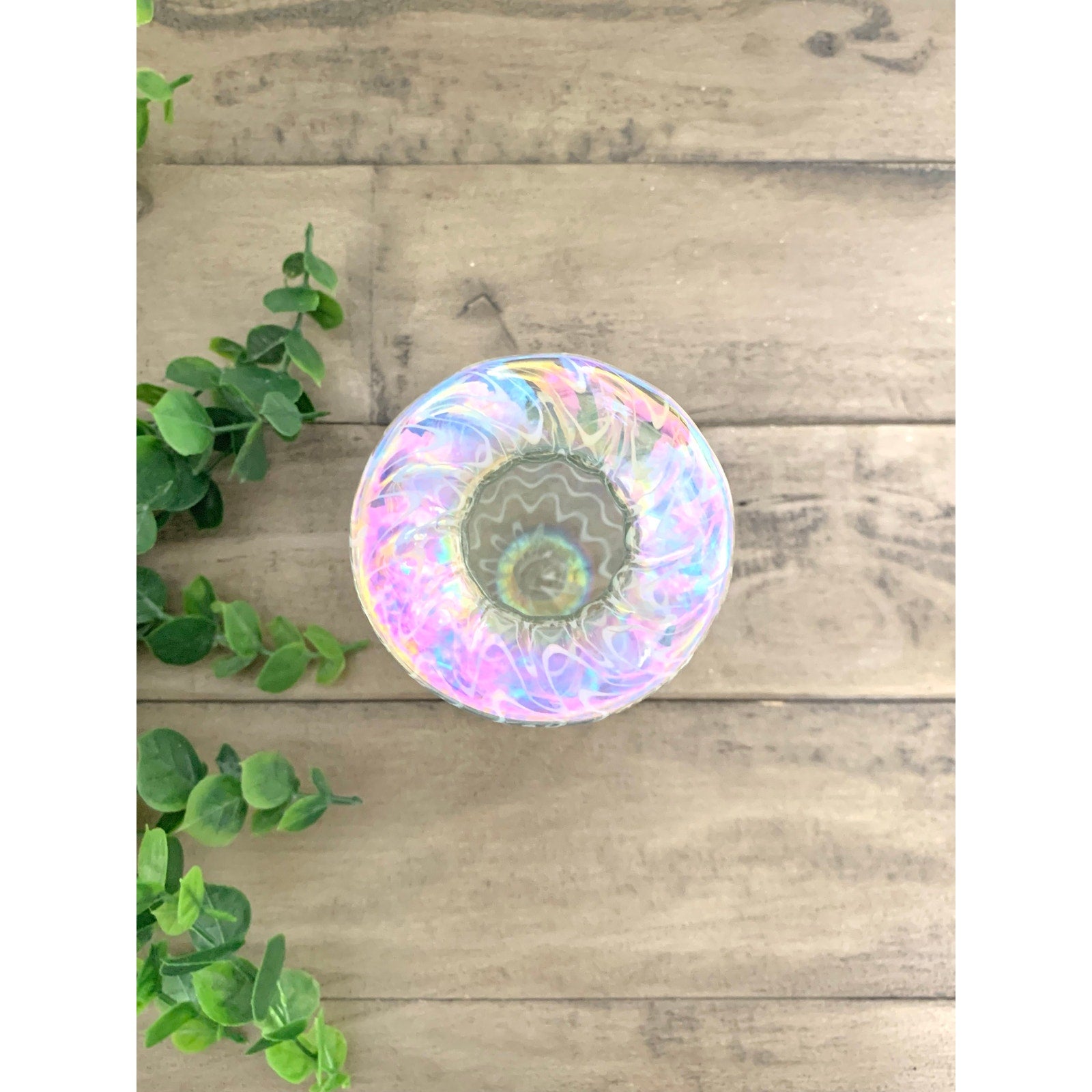 Signed and dated (1999) this exquisite art glass vase from Glass Eye Studio features a dreamy, pearlescent glow with delicate wave patterning and an elegant flared rim. In soft pastel hues of blush, gold, and opal, it captures light with every angle. A stunning handblown collectible from the iconic Pacific Northwest studio. Great condition, see one makers mark near base on inside, a line.