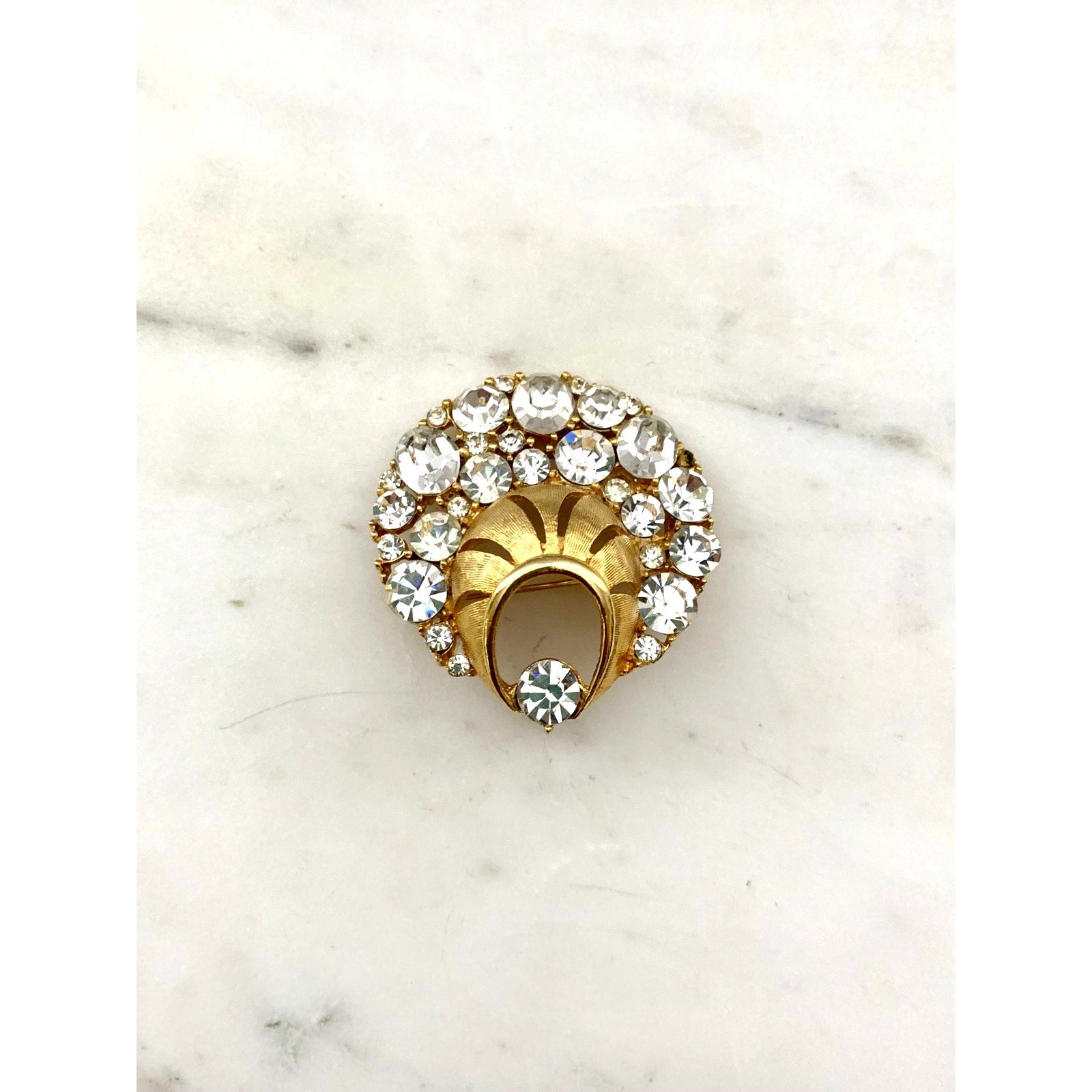 This dazzling vintage brooch features a layered clamshell-inspired design, crafted in goldtone metal and adorned with brilliant prong-set clear rhinestones. The textured gold detail adds dimension, while the rhinestones catch the light beautifully for a timeless sparkle. A classic mid-century costume jewelry piece, this brooch makes a wonderful statement accessory for jackets, scarves, dresses, or even as a decorative accent on hats and handbags.