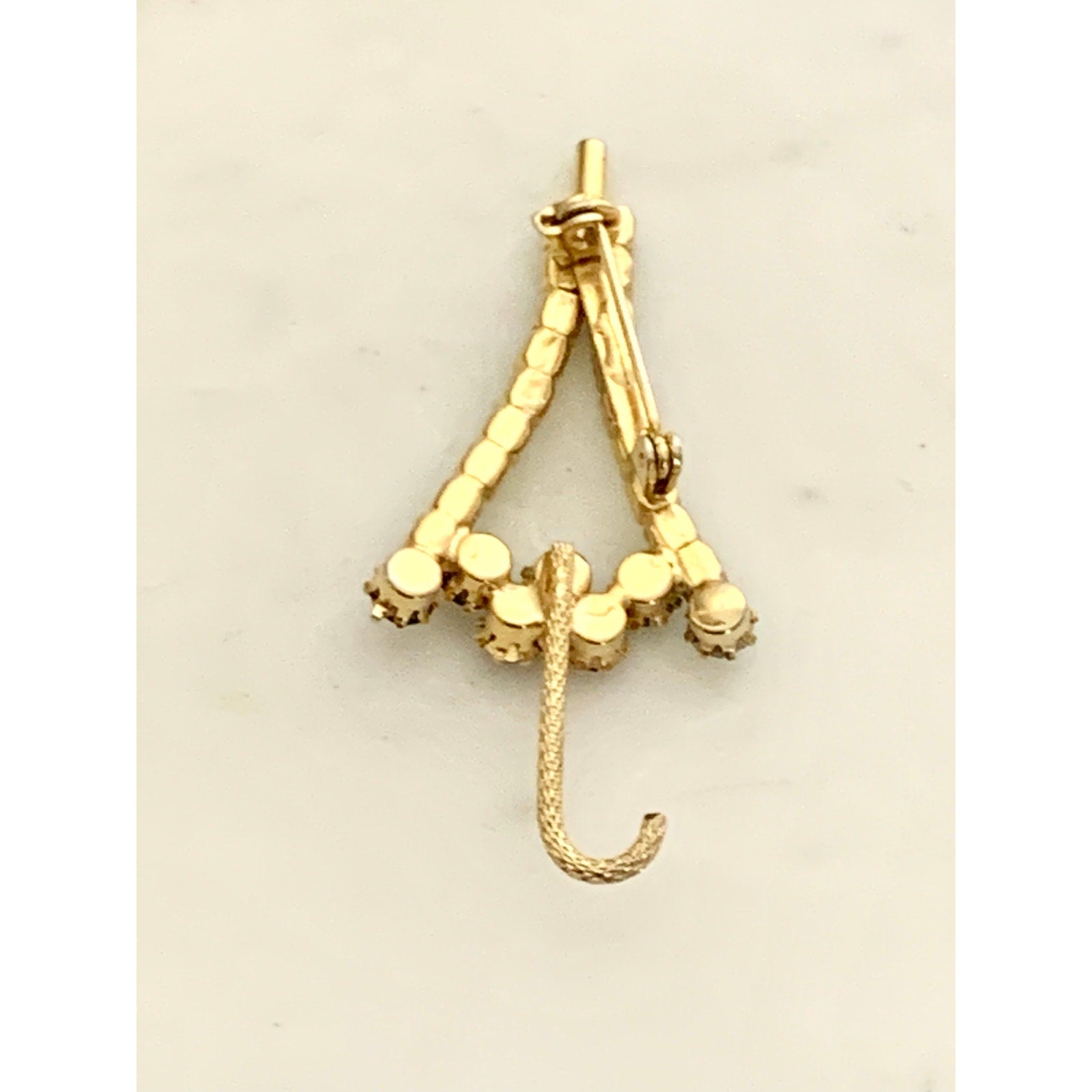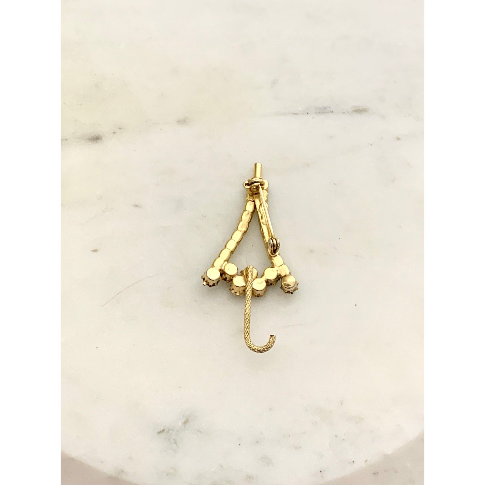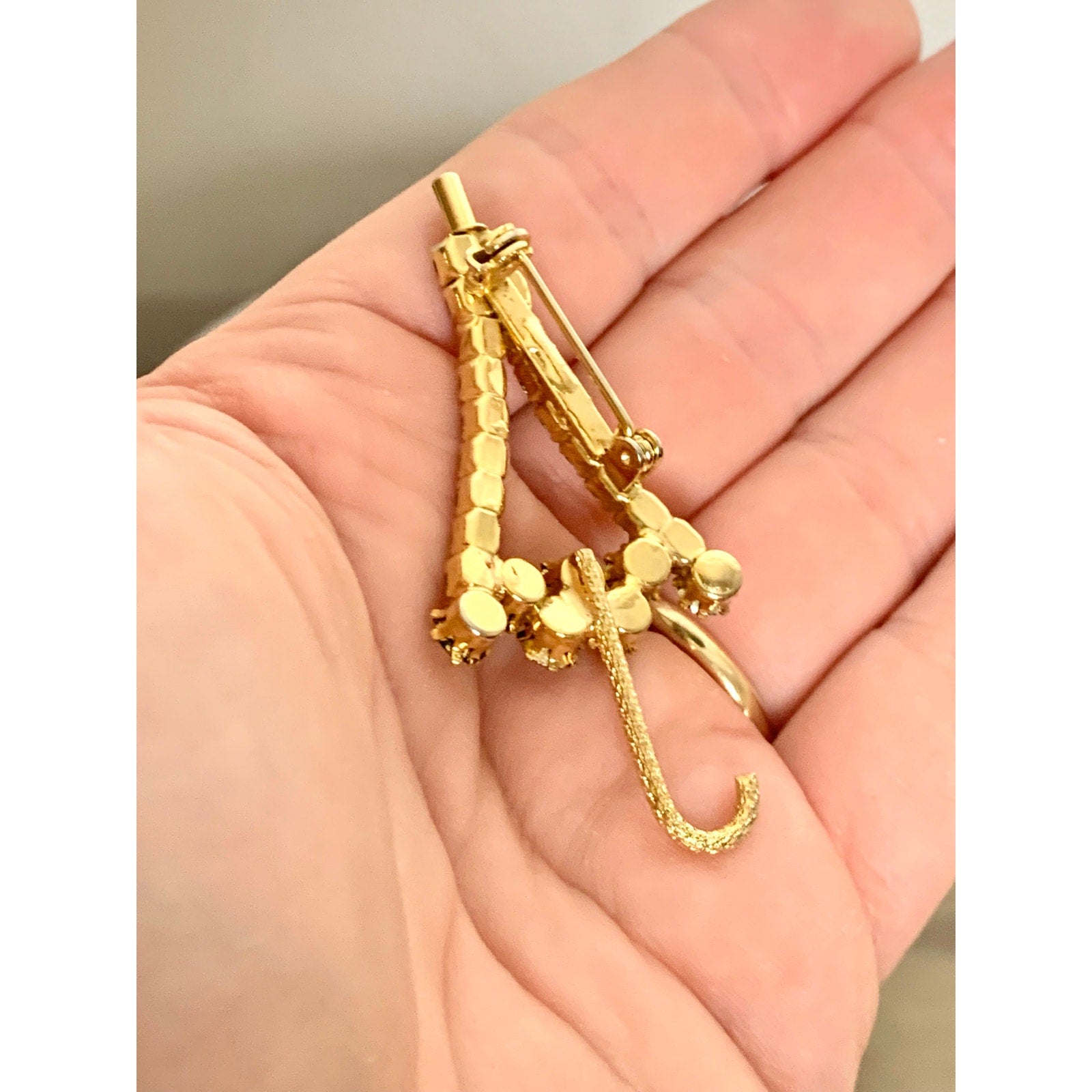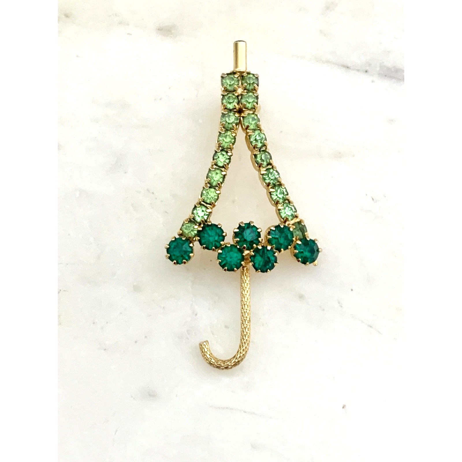 This charming vintage brooch features a whimsical umbrella design adorned with brilliant emerald green rhinestones in two shades. The gold-tone metal handle and frame add a touch of classic mid-century glamour, making this piece perfect for collectors and lovers of unique costume jewelry. A lovely statement pin for a jacket, hat, lapel, or scarf.