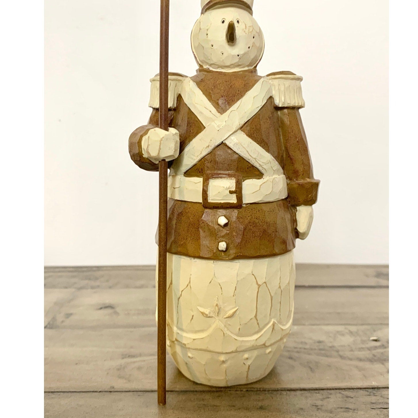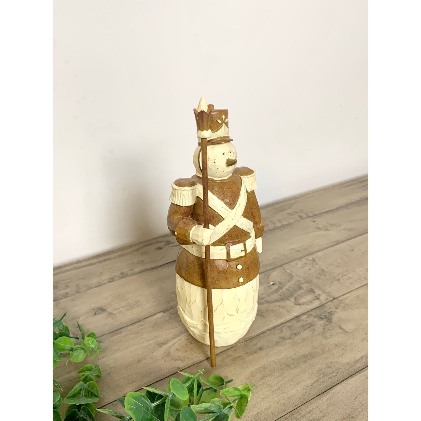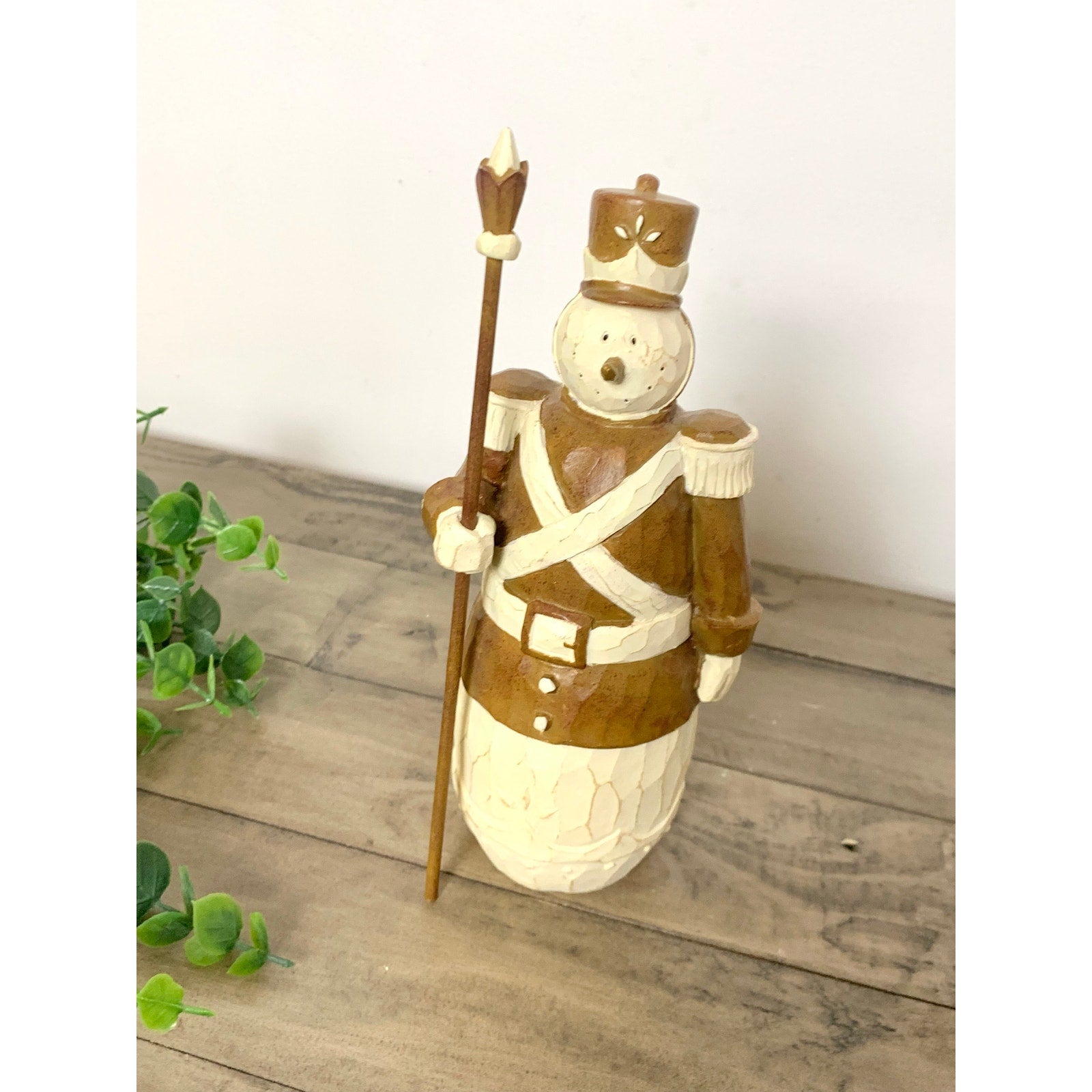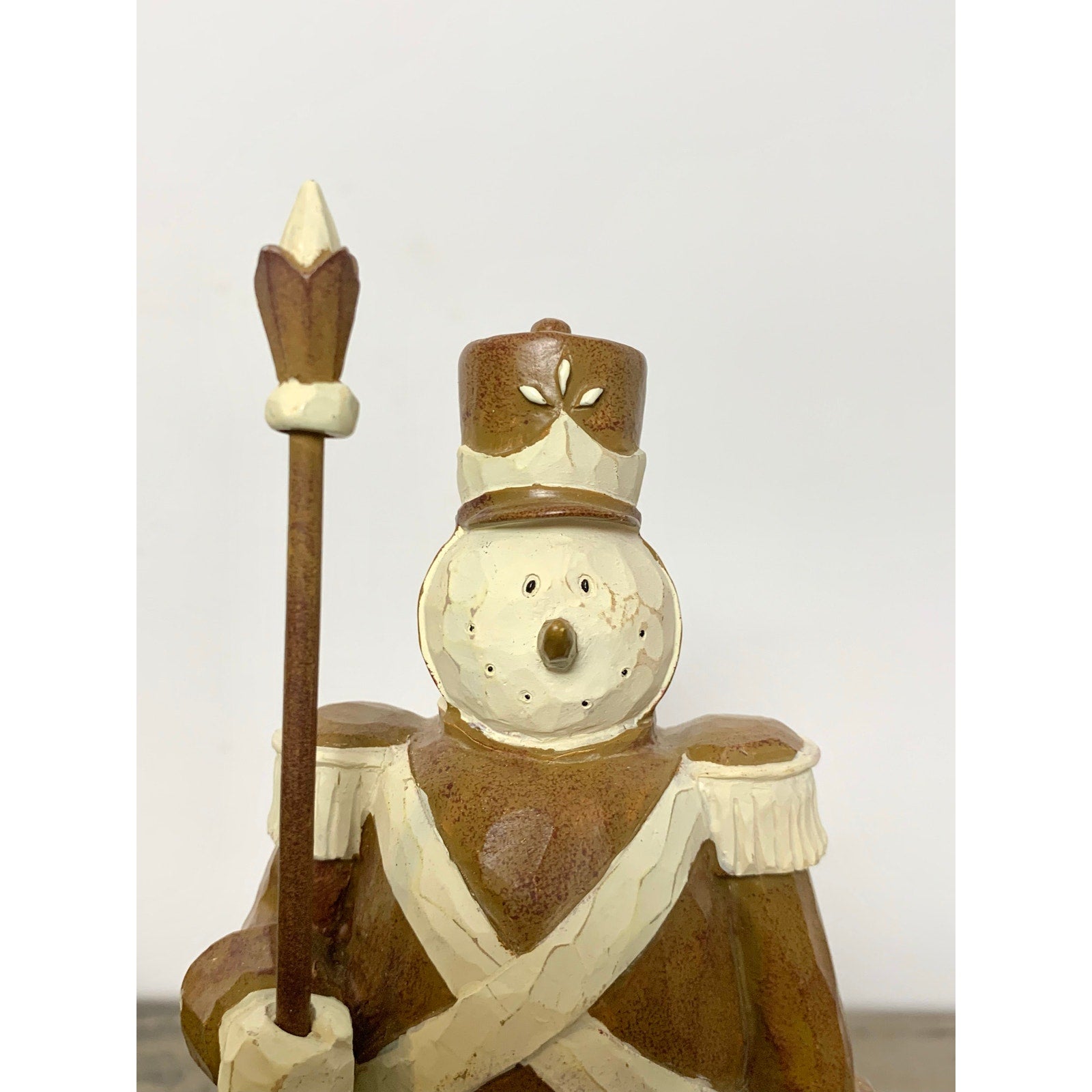This charming vintage snowman soldier figurine is beautifully hand carved with rustic folk art detail. The warm brown and cream tones give it a cozy, cabin-style feel—perfect for farmhouse or woodland Christmas displays. Featuring a tall hat, uniform, and staff, this piece brings a touch of nostalgic winter charm to mantels, shelves, or table vignettes.