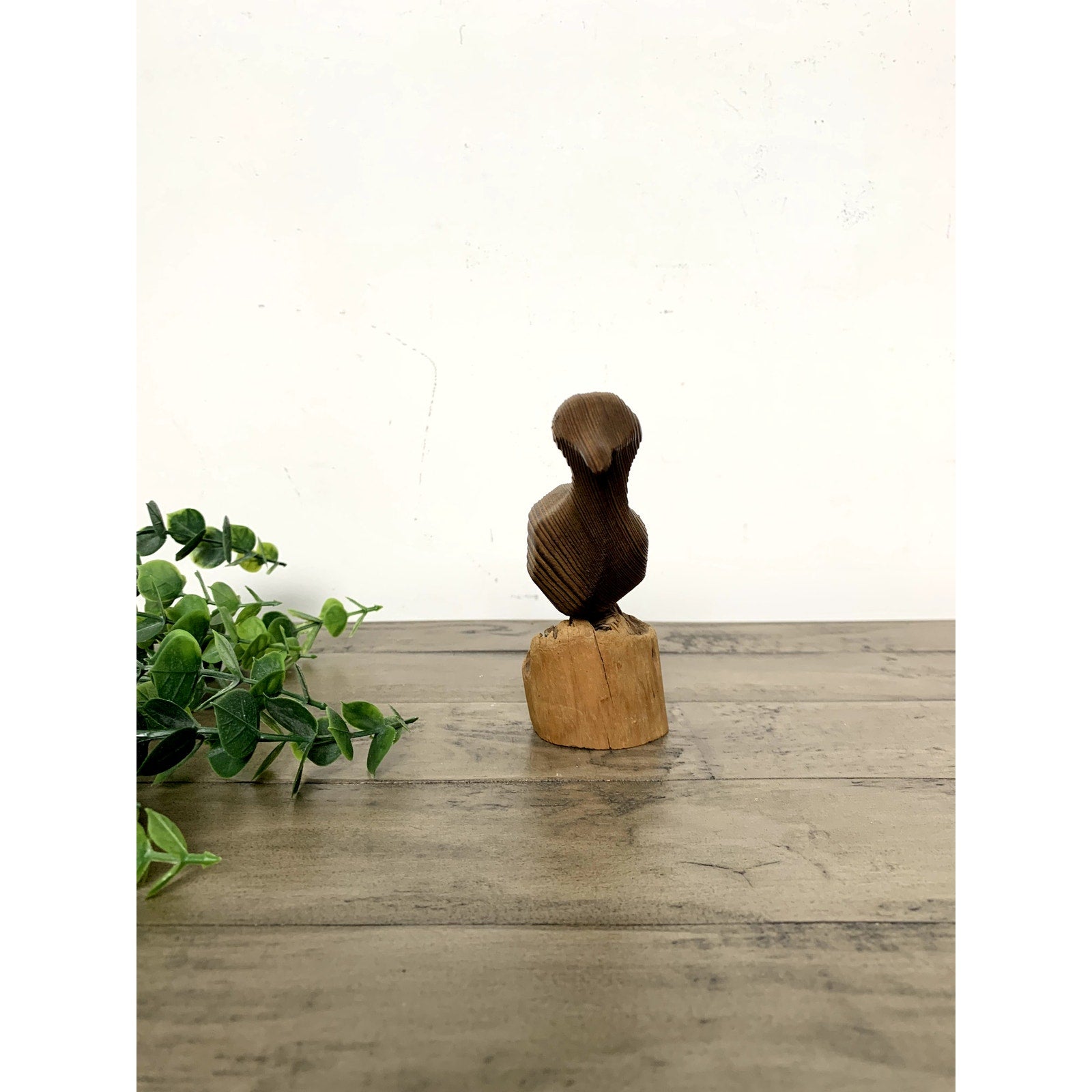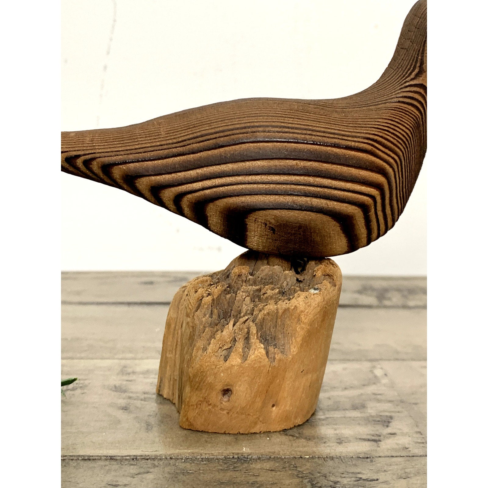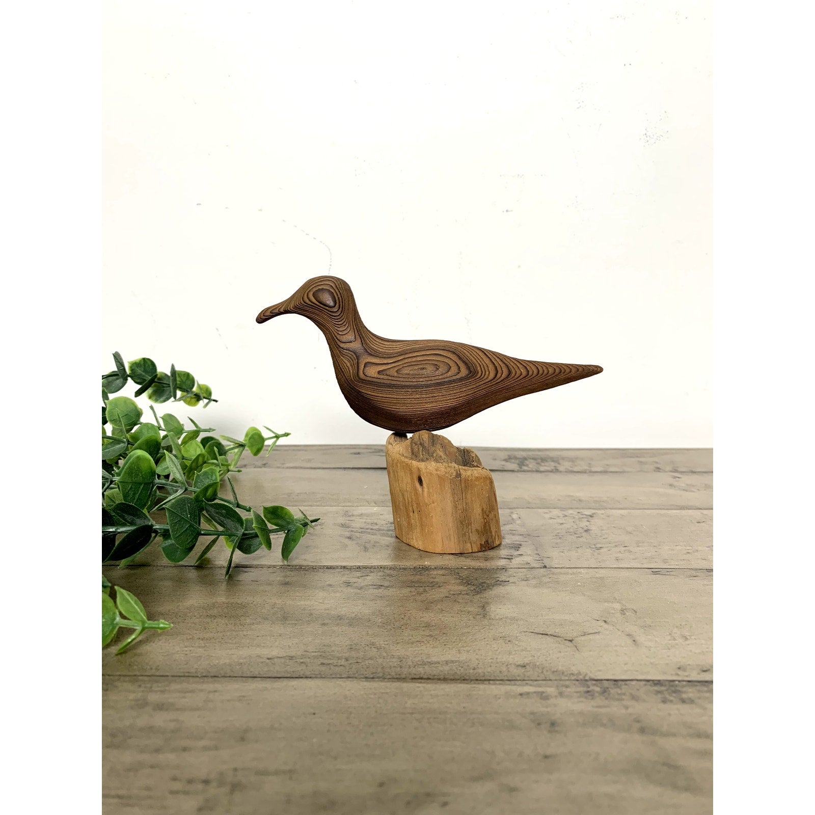 Charming vintage hand-carved wooden shorebird figurine mounted on a natural wood base. The bird is beautifully shaped with carved detailing that highlights the grain and character of the wood, giving it a rustic yet refined presence.