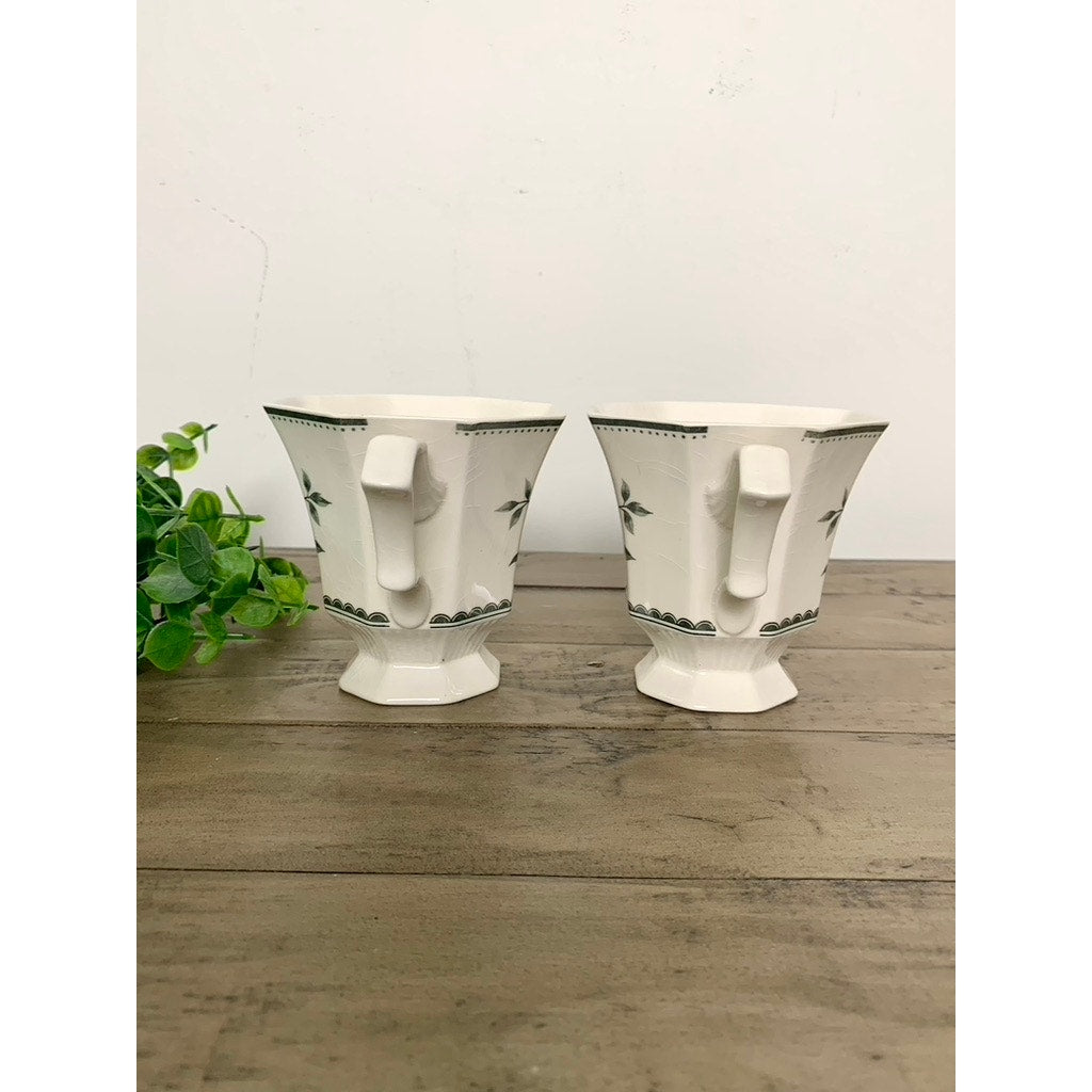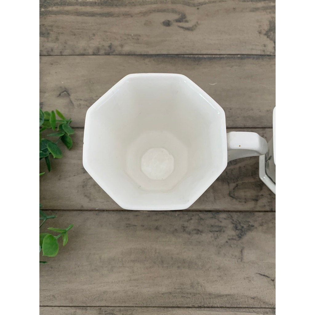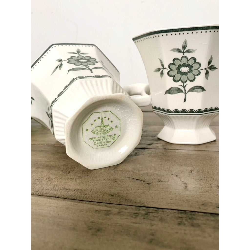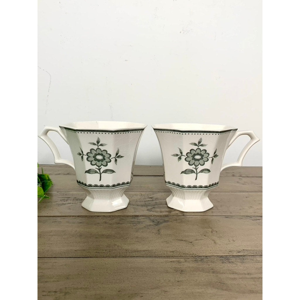 Timeless and elegant, this pair of Independence by Castleton Ironstone (Japan) mugs features a lovely floral motif in green on a crisp white background. The octagonal footed base and delicate handles add a touch of vintage charm, perfect for collectors or daily use.