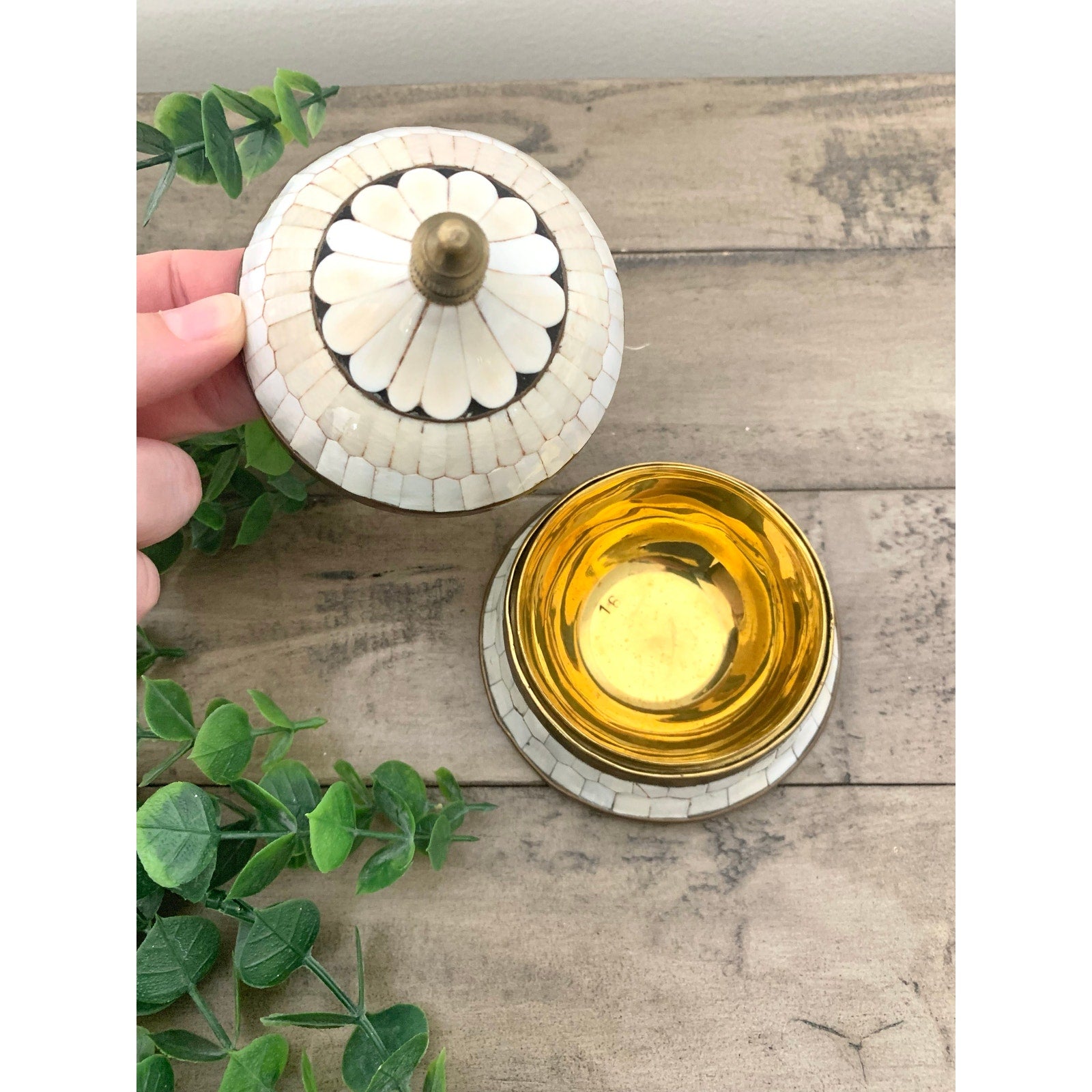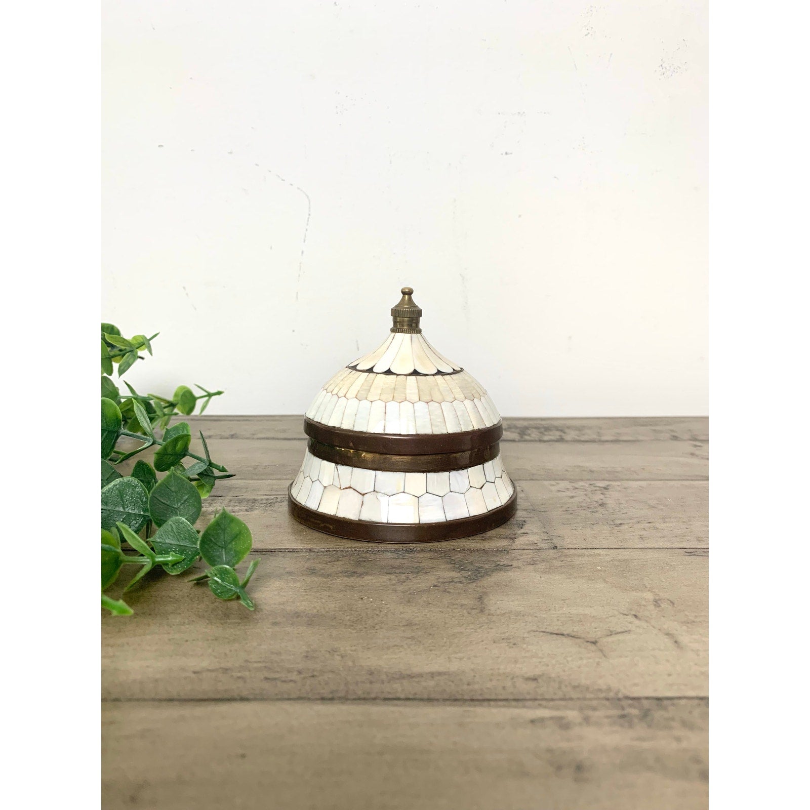 Beautiful vintage domed and lidded trinket box crafted from inlaid bone tiles with brass accents and finial top. The geometric mosaic design gives it an elegant, timeless look, while the interior is lined in a gold-tone metal finish that adds a touch of luxury.