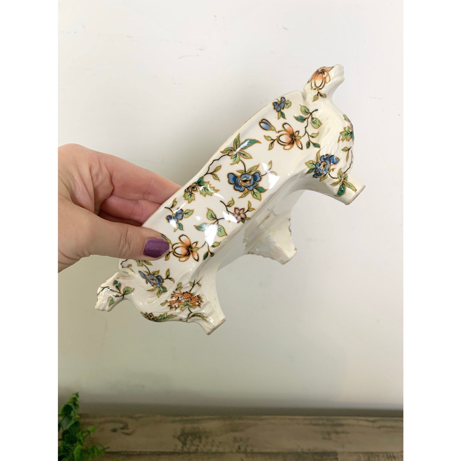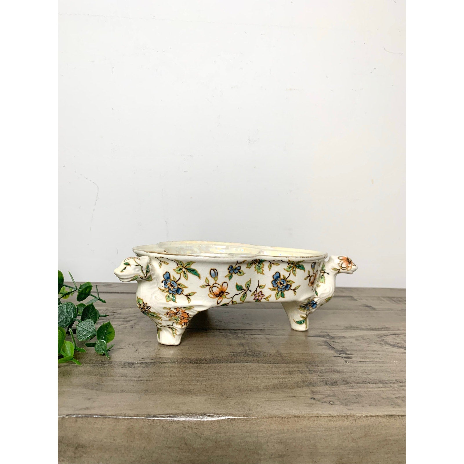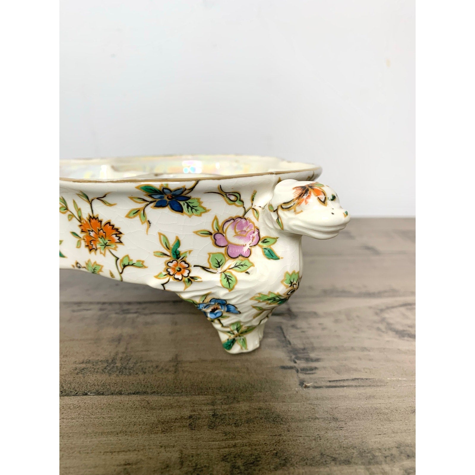 This is a vintage hand painted ceramic dish from Japan, designed with whimsical animal handles (possibly dragons or pheonix) and vibrant floral patterns in shades of blue, orange, and green. The interior features a subtle iridescent luster glaze with divided compartments, perfect for use as a trinket dish, vanity catchall, or serving piece. Raised on three legs, this collectible piece adds charm to any room.