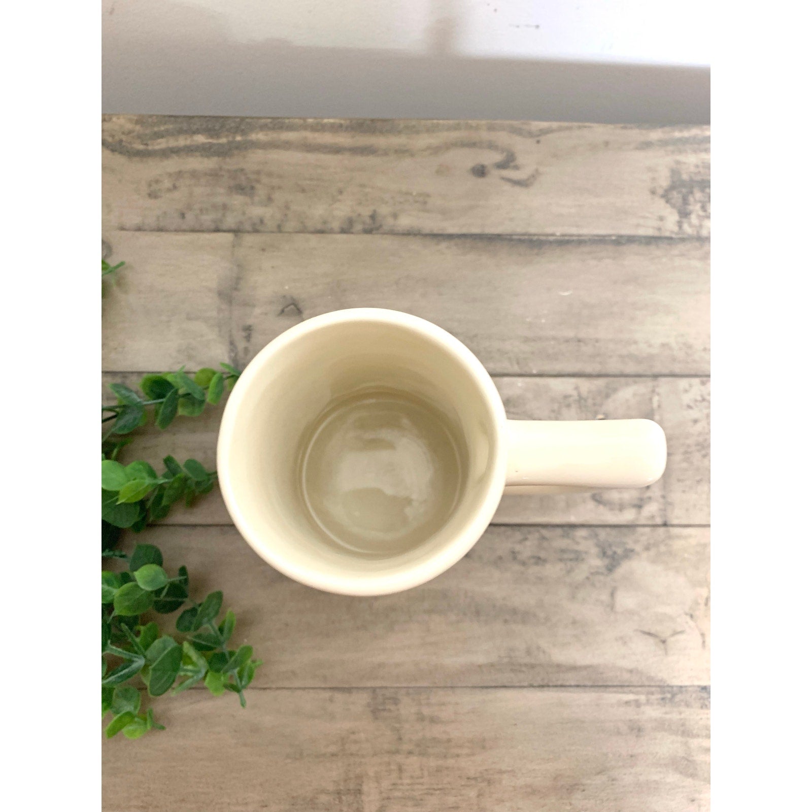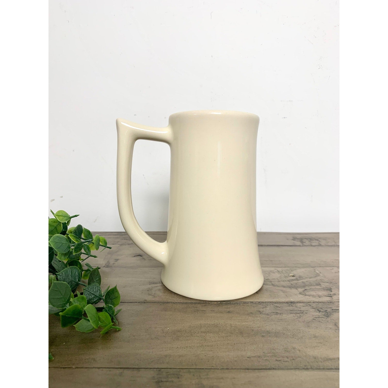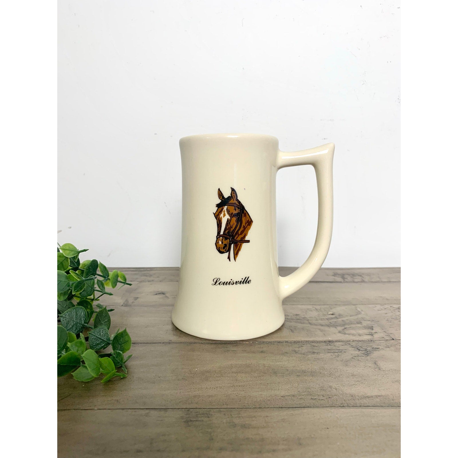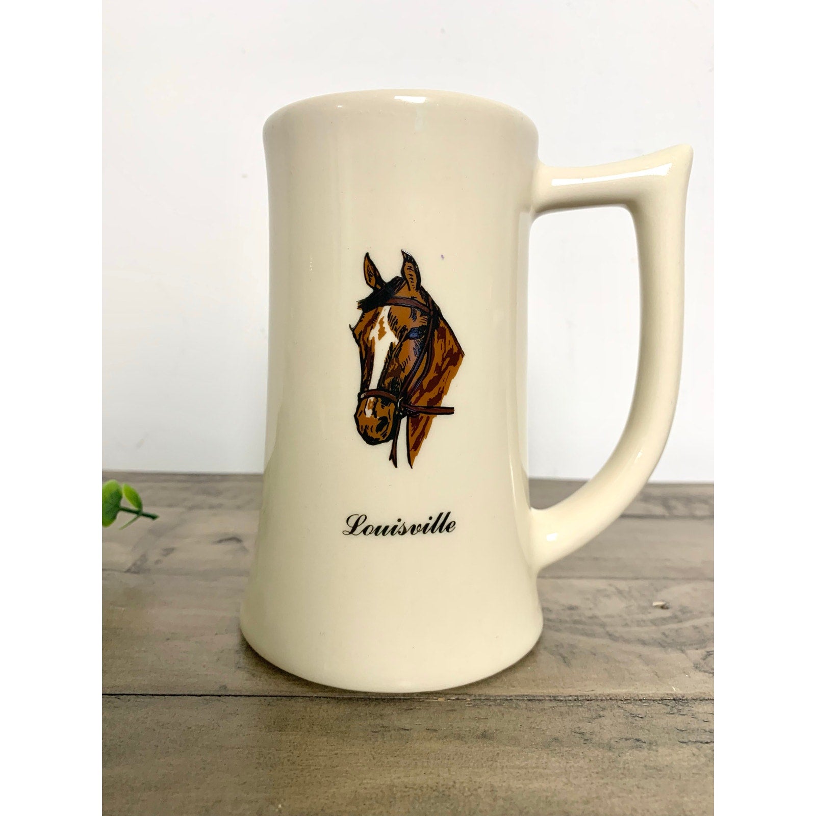 This vintage ceramic mug features a striking horse head illustration above the word “Louisville,” making it a perfect collectible for equestrian enthusiasts or Kentucky souvenir collectors. Crafted in the USA, this piece has a sturdy pottery build and a creamy off-white glaze with a flared base and handle.