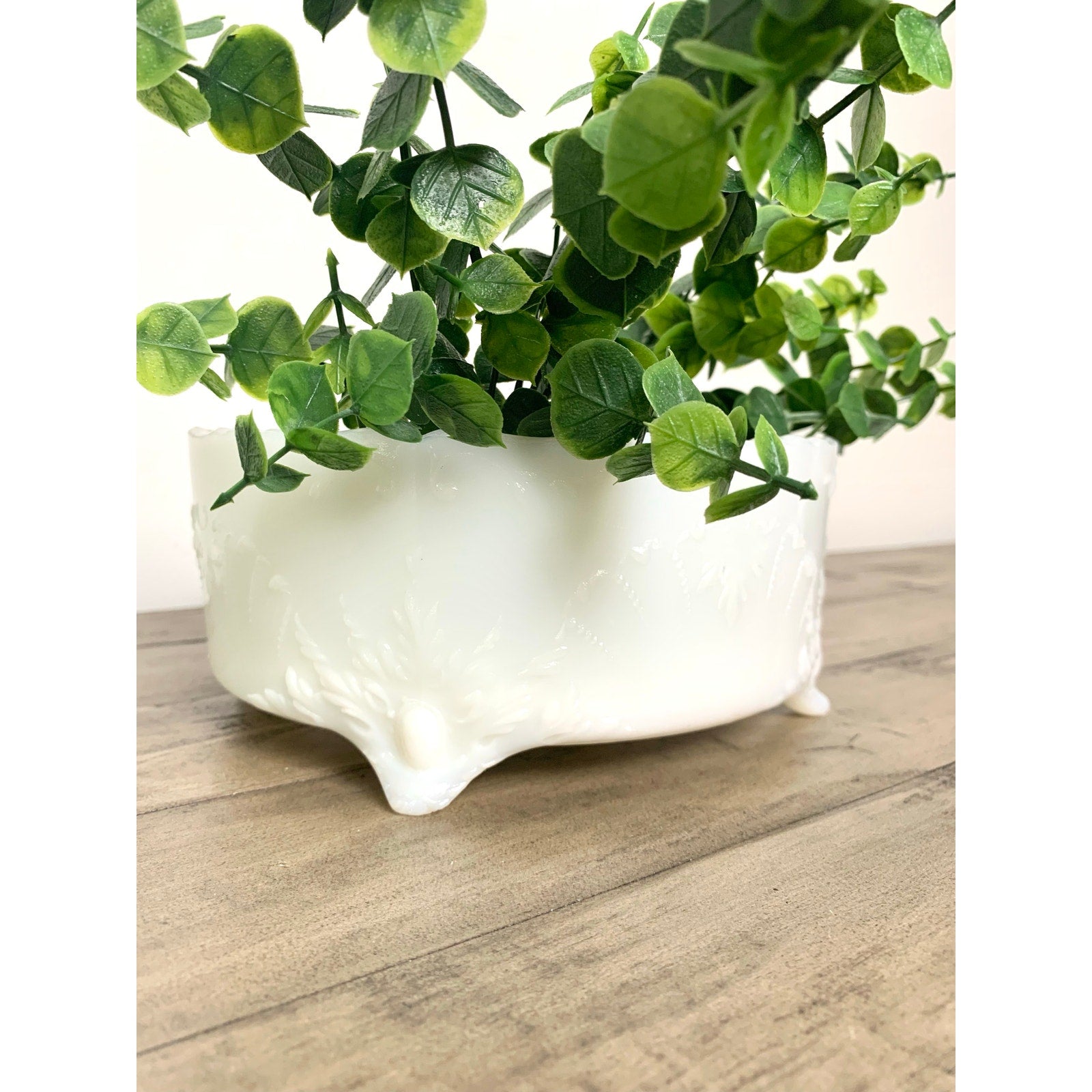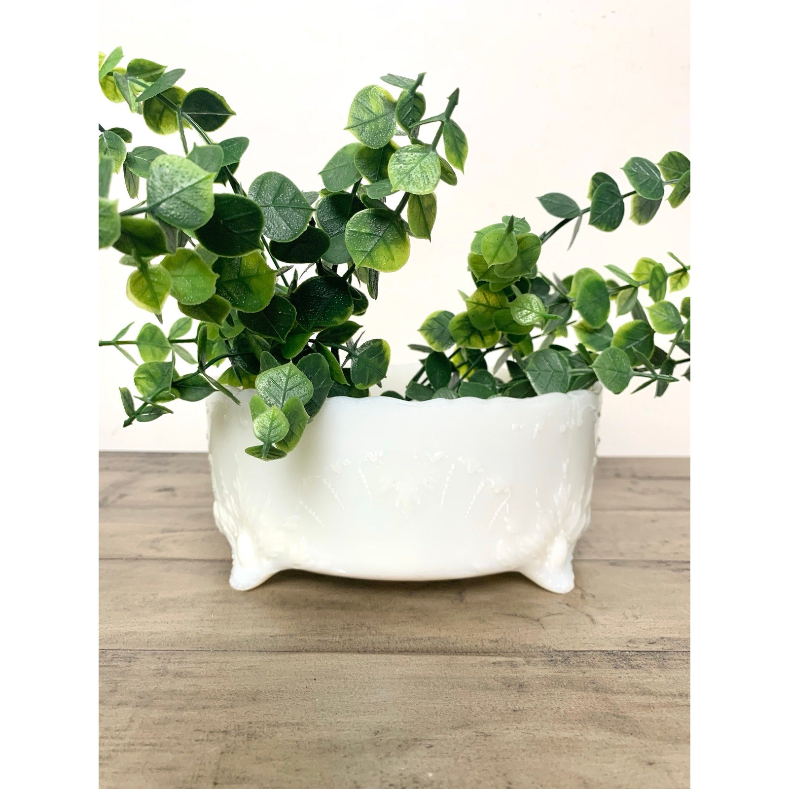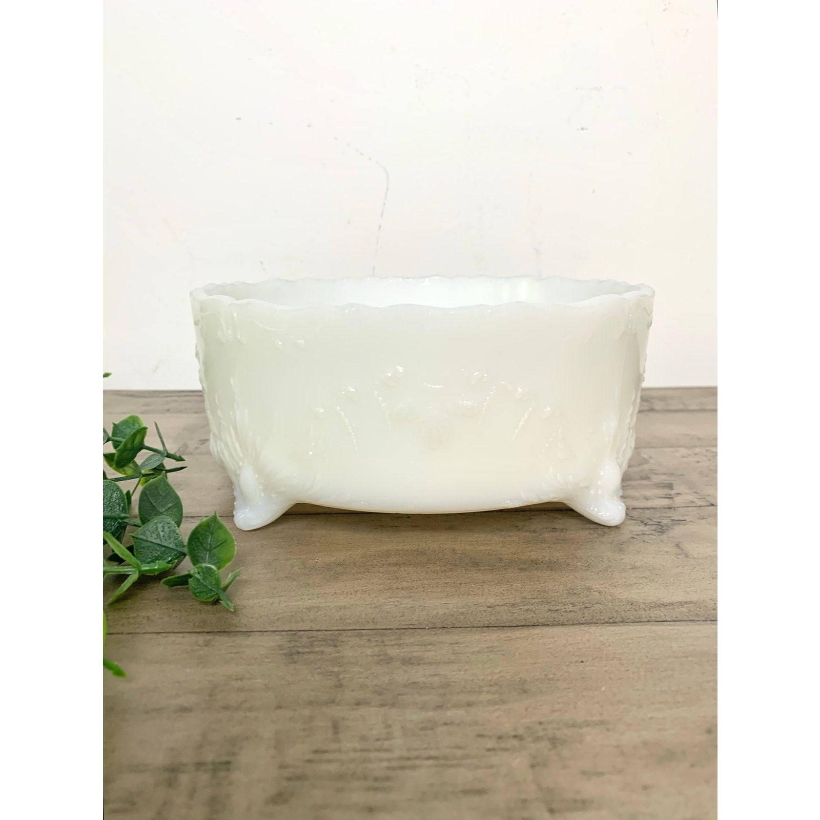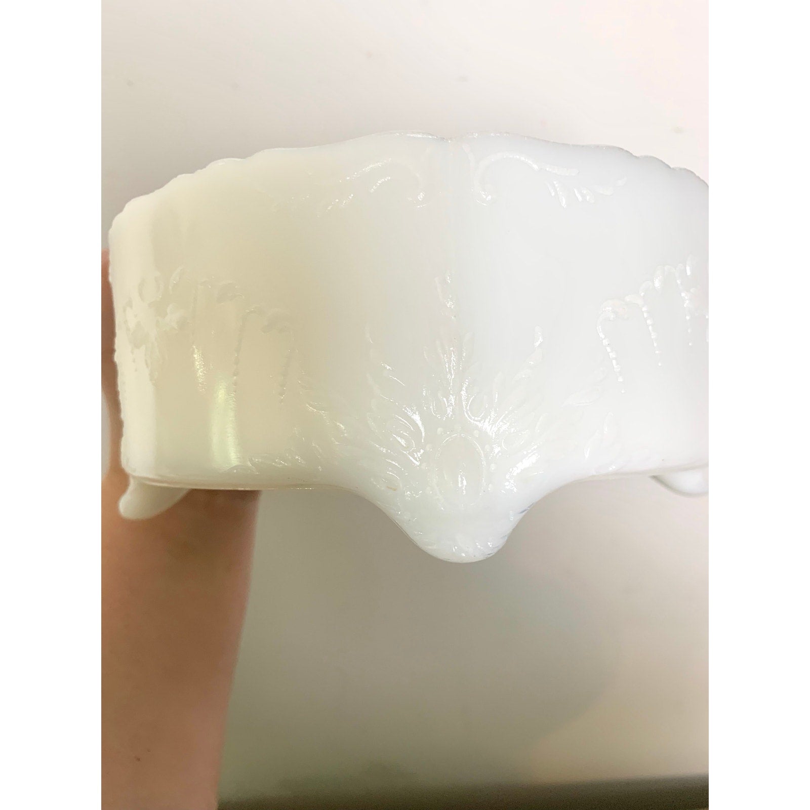Classic vintage milk glass bowl with embossed decorative detailing and a gently scalloped rim. Elevated on small feet, this piece has an elegant presence, perfect as a table centerpiece, serving bowl, or display dish. Its timeless white milk glass complements a wide range of interiors, from farmhouse, shabby chic, and cottagecore to mid-century and traditional. A versatile collectible that can be styled for everyday use or special gatherings.