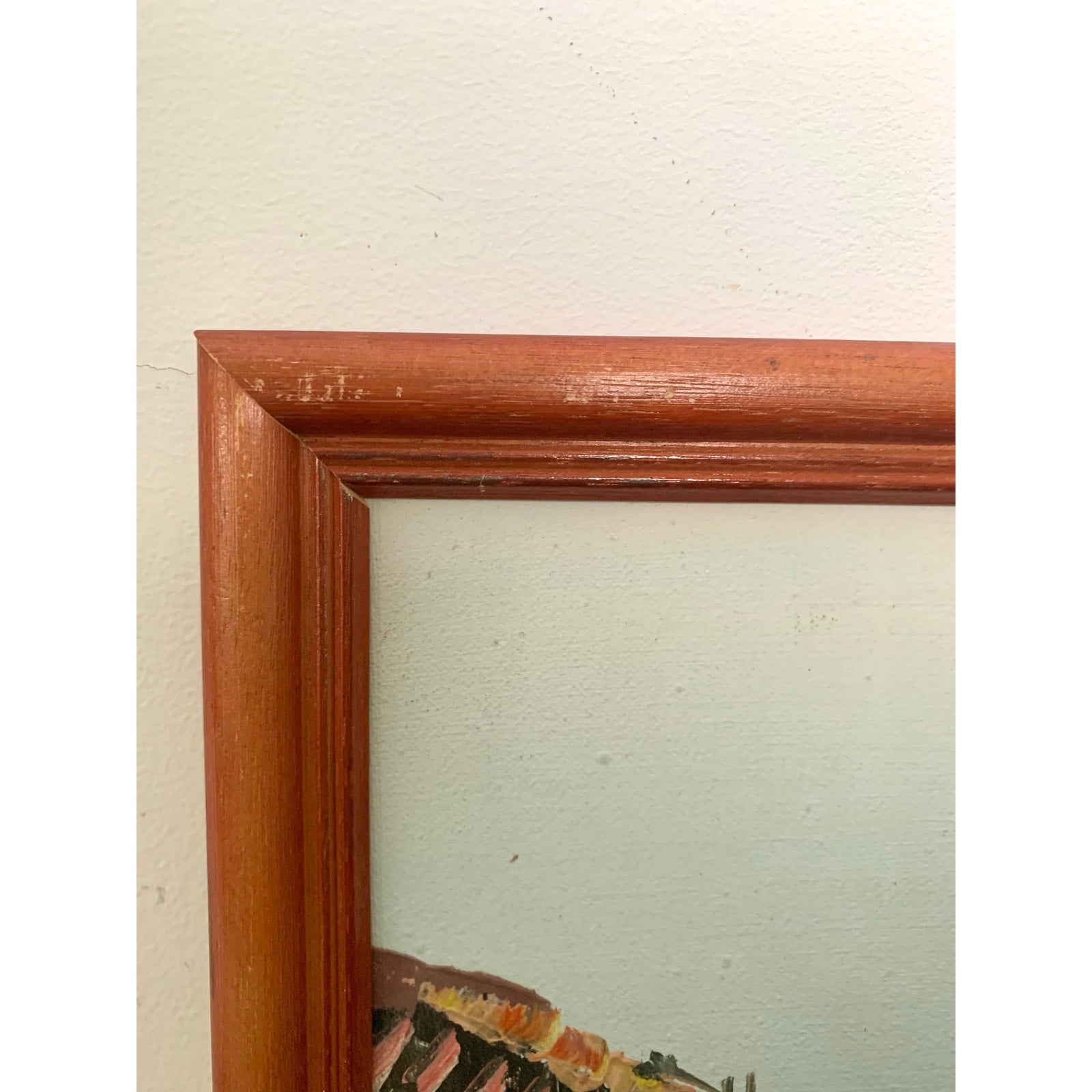 Bring timeless nautical charm into your space with this vintage oil painting on canvas, beautifully signed by the artist Taylor. The artwork features a lively harbor scene with docked boats, painted in rich tones with expressive texture. It comes framed in a simple wood frame and is ready to hang.