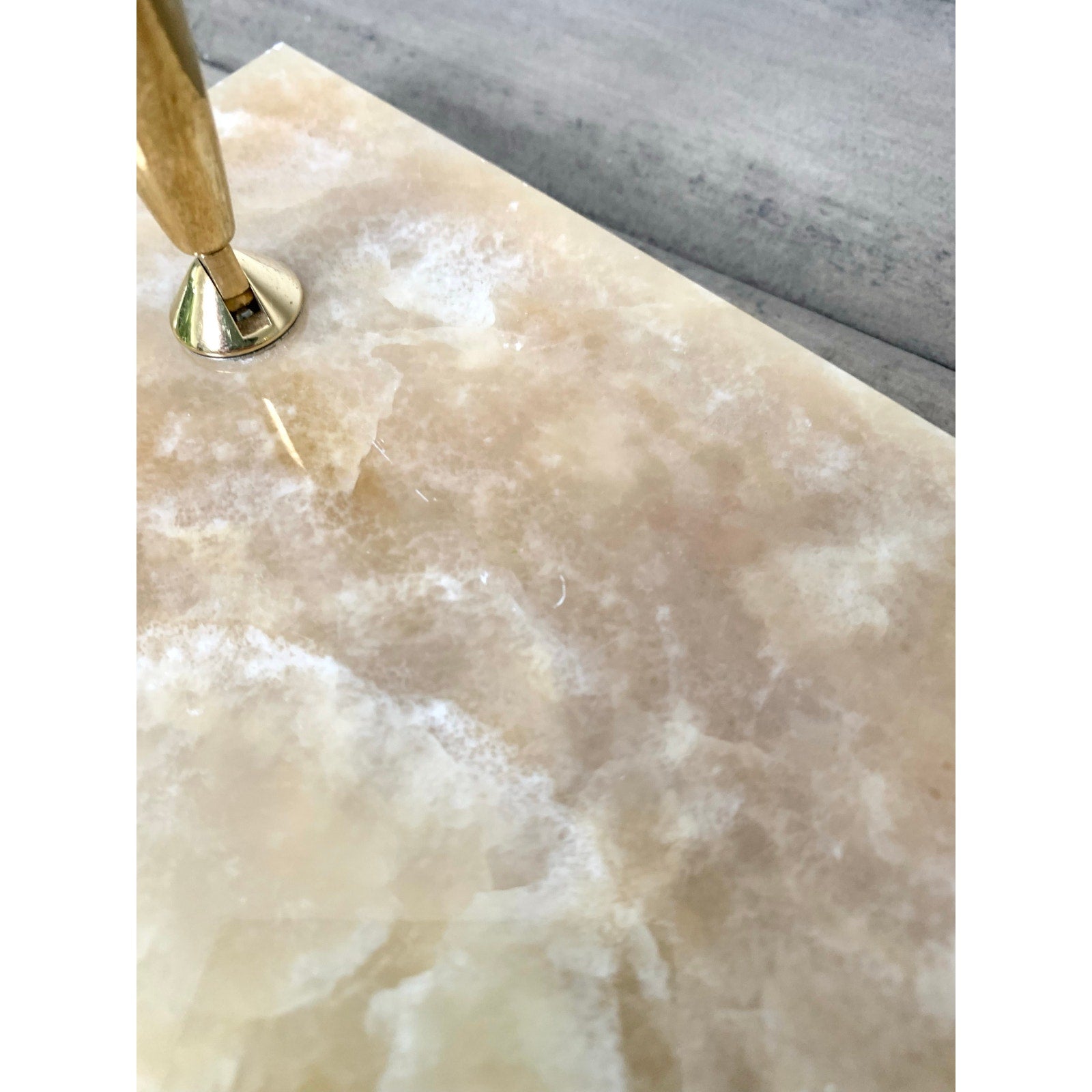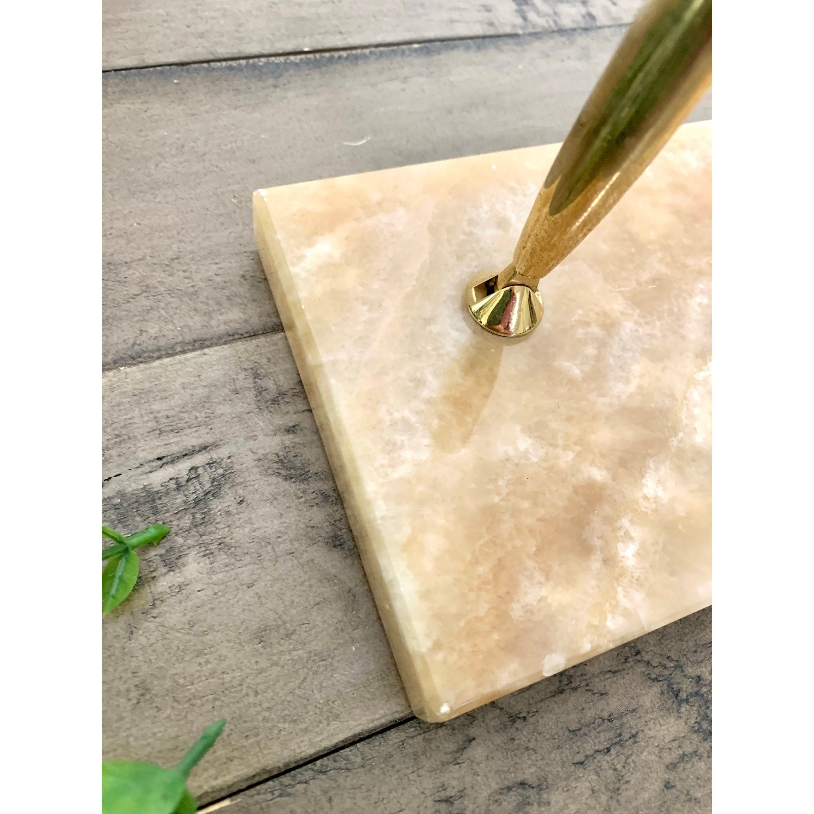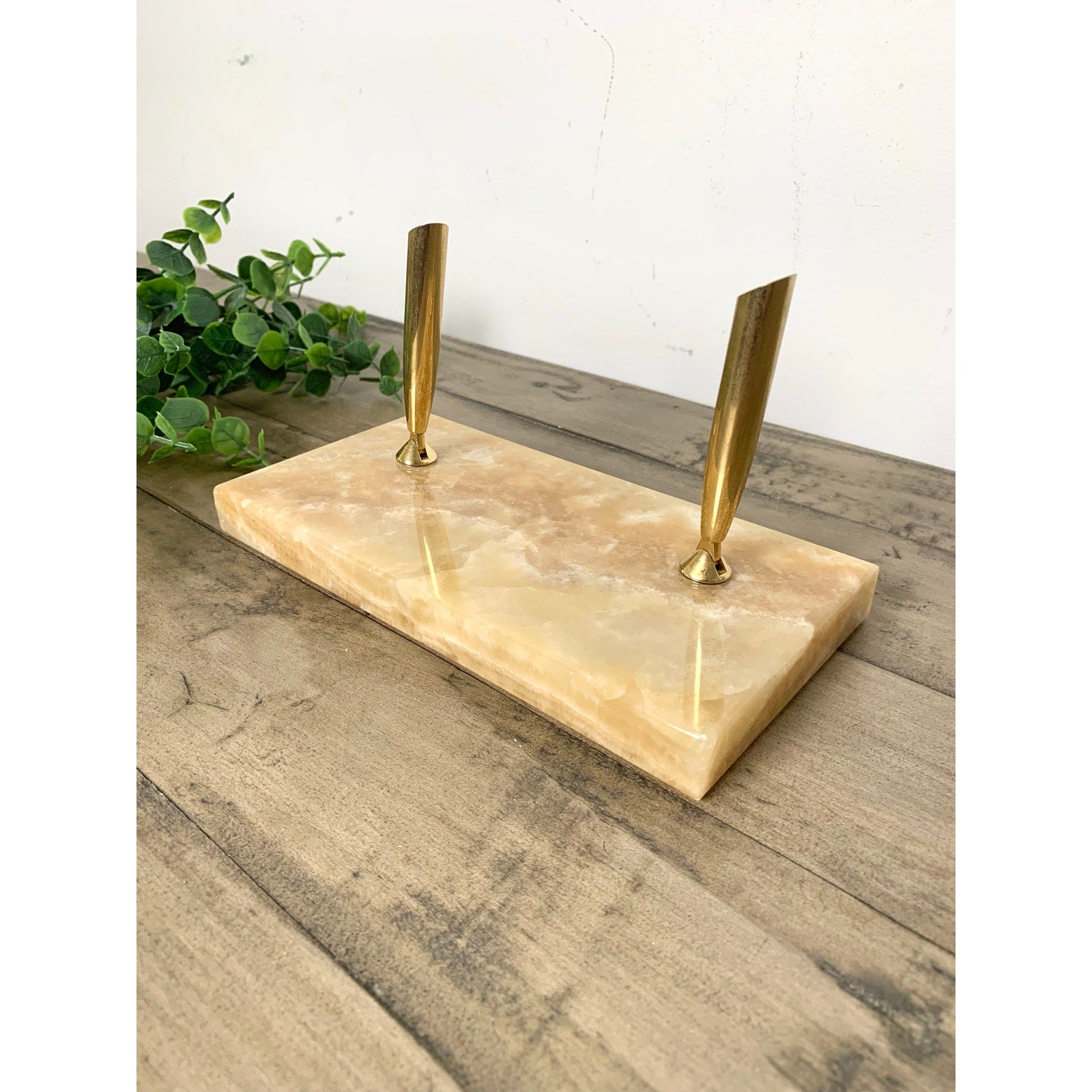 Elegant and regal, this vintage double pen holder featuring a polished onyx stone base has two angled and adjustable brass pen holders. The rectangular base has warm brown, cream, and caramel tones with natural stone veining, and the underside is covered in black felt to protect surfaces. Perfect for a home office, executive desk, or as a beautiful gift for stationery lovers and collectors of midcentury desk accessories.