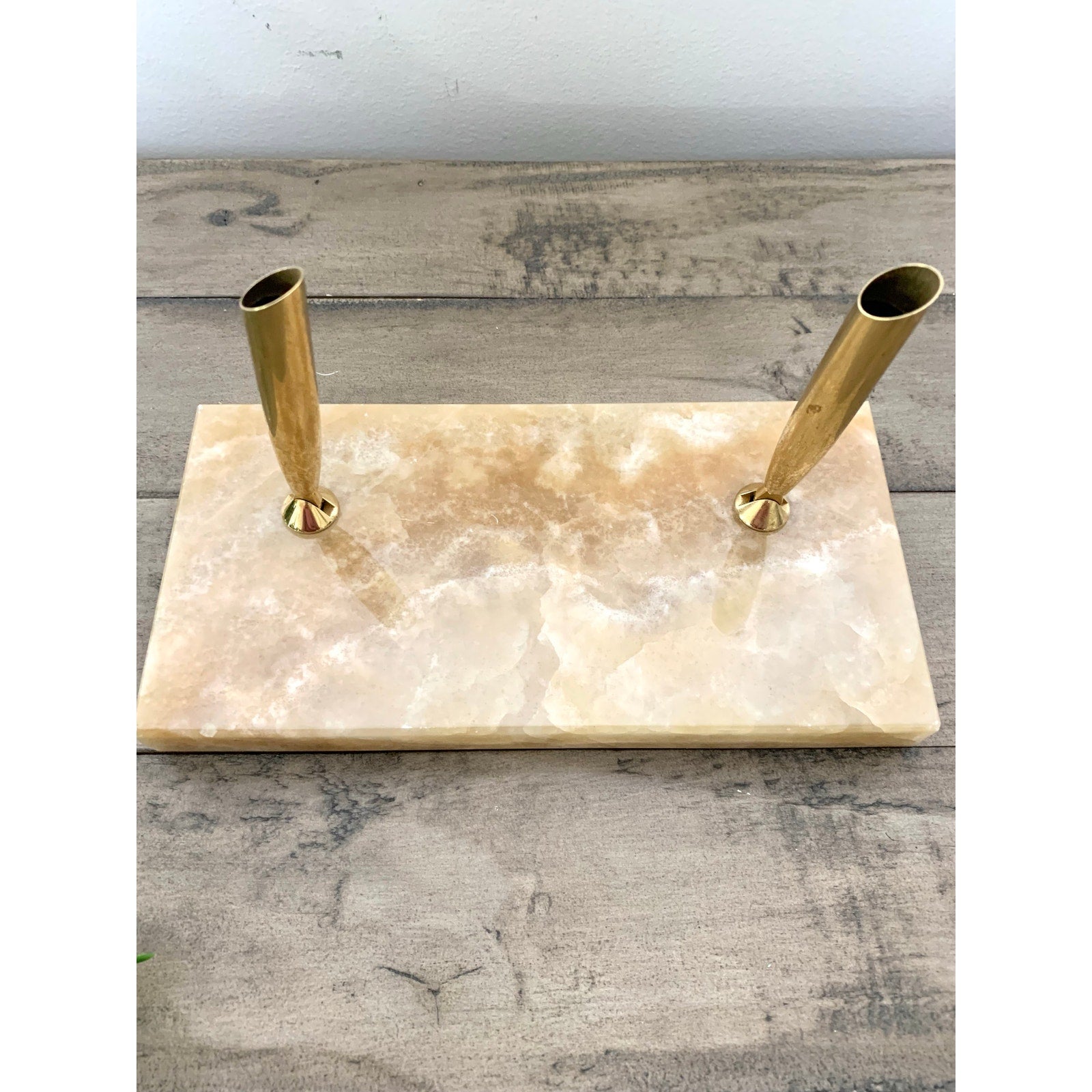 Vintage Onyx Stone Double Brass Pen Holder Desk Stand Office Old Money Academia