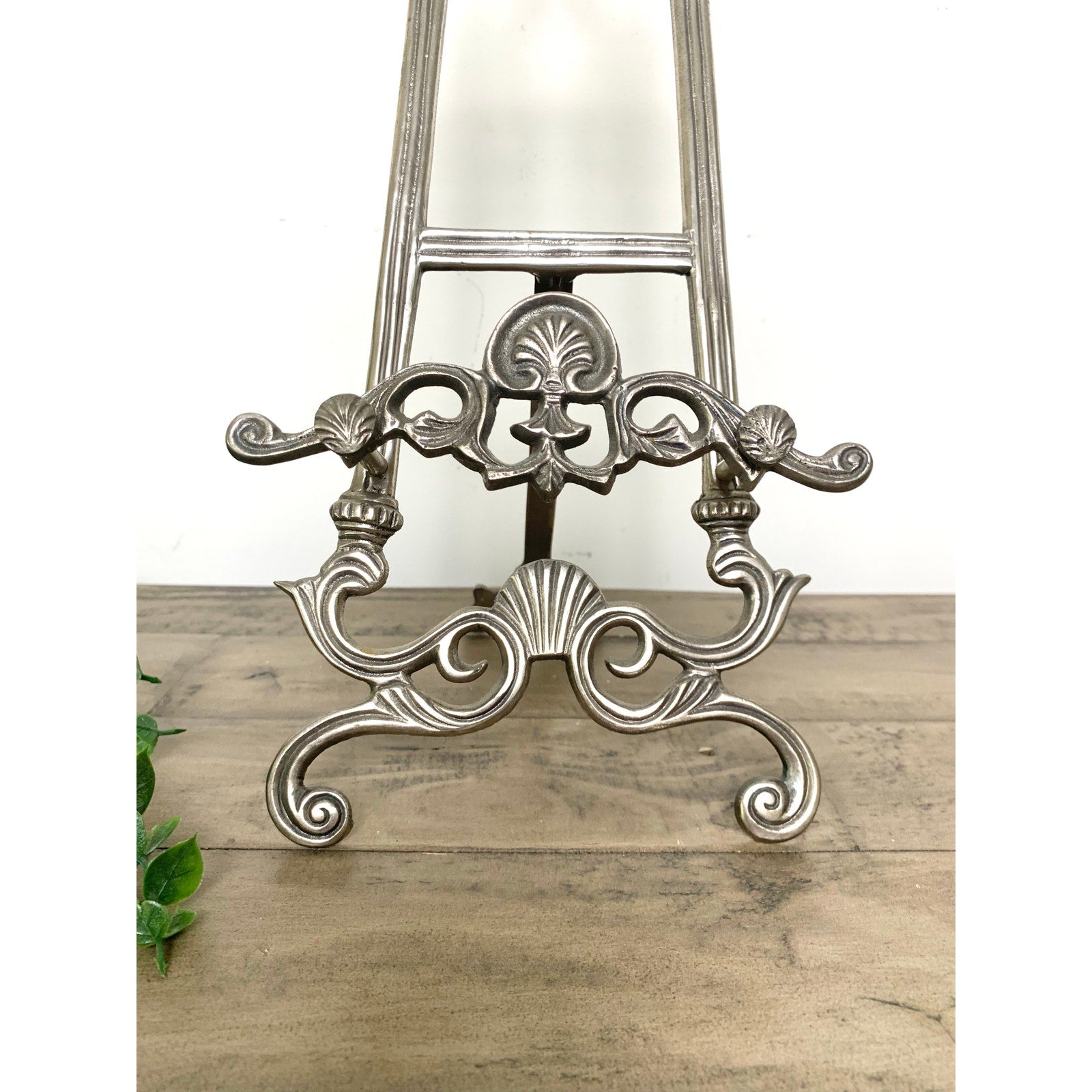 Beautiful vintage ornate metal display easel in a silver tone finish with intricate scrollwork and shell details. This folding stand is both functional and decorative, perfect for displaying art, framed photos, collector plates, or books.
