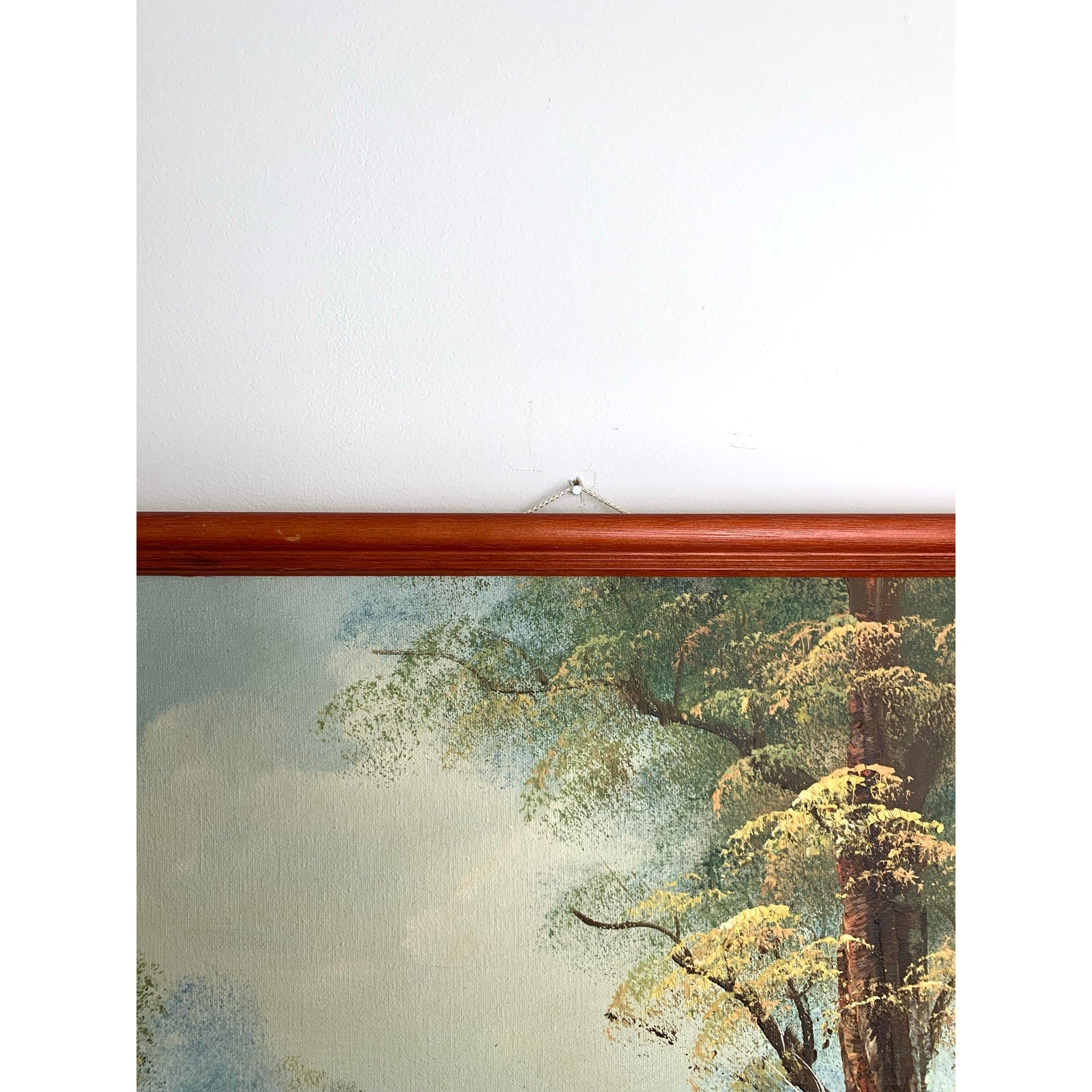 This vintage oil painting by Taylor beautifully depicts a peaceful riverside landscape with tall trees, soft light, and a rustic cabin tucked along the water’s edge. The textured brushwork and layered greens give the scene a serene, atmospheric quality reminiscent of classic mid-century landscape art. Perfect for bringing a sense of calm and natural beauty into your home.