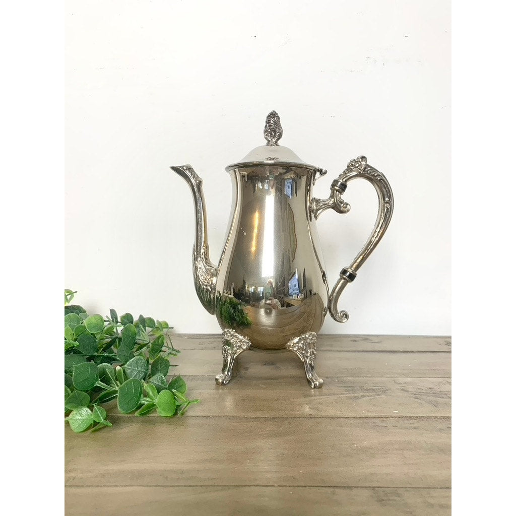 Lovely vintage silverplate coffee/tea pot with elegant curved lines, floral accents, and ornate feet. The hinged lid lifts smoothly, and the detailed handle and spout add that beautiful old-world charm that vintage silver is known for.