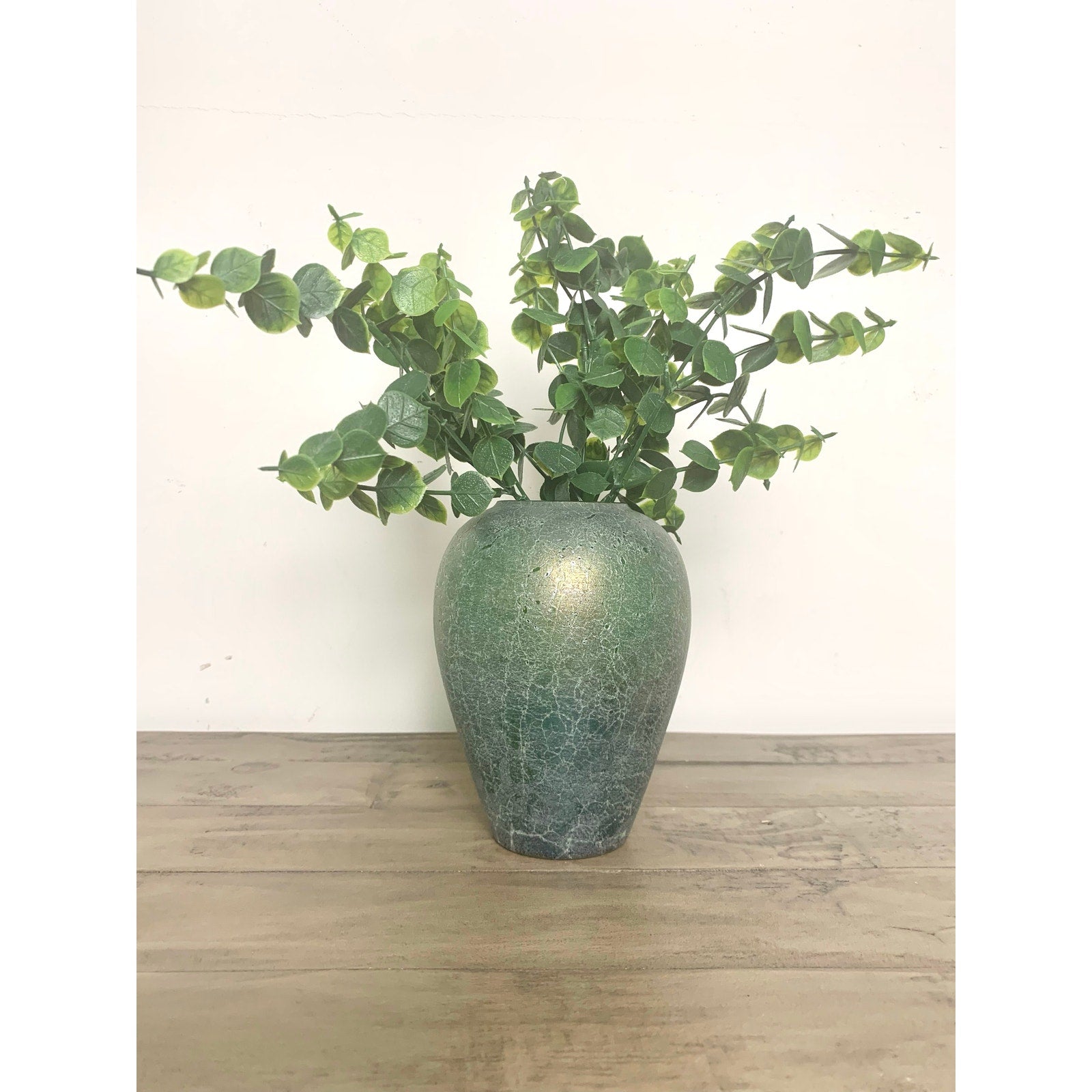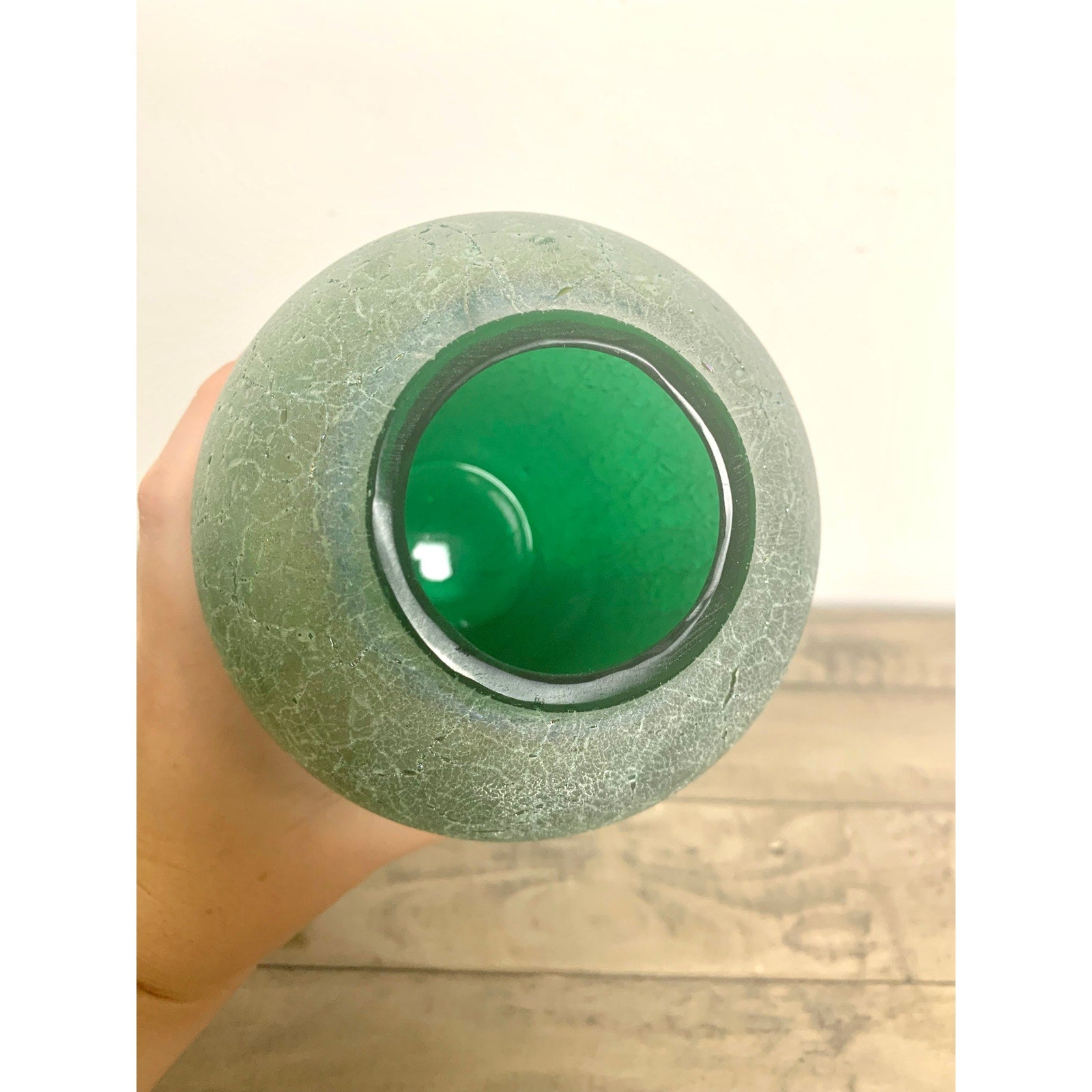 This gorgeous vintage mouth blown glass vase by Silvestri features a rich emerald green tone with a crackle texture and a subtle iridescent golden sheen that catches the light beautifully. Each piece is individually mouth blown, making it truly one-of-a-kind. Perfect for displaying fresh flowers, faux stems, or as a striking standalone accent in your home decor.