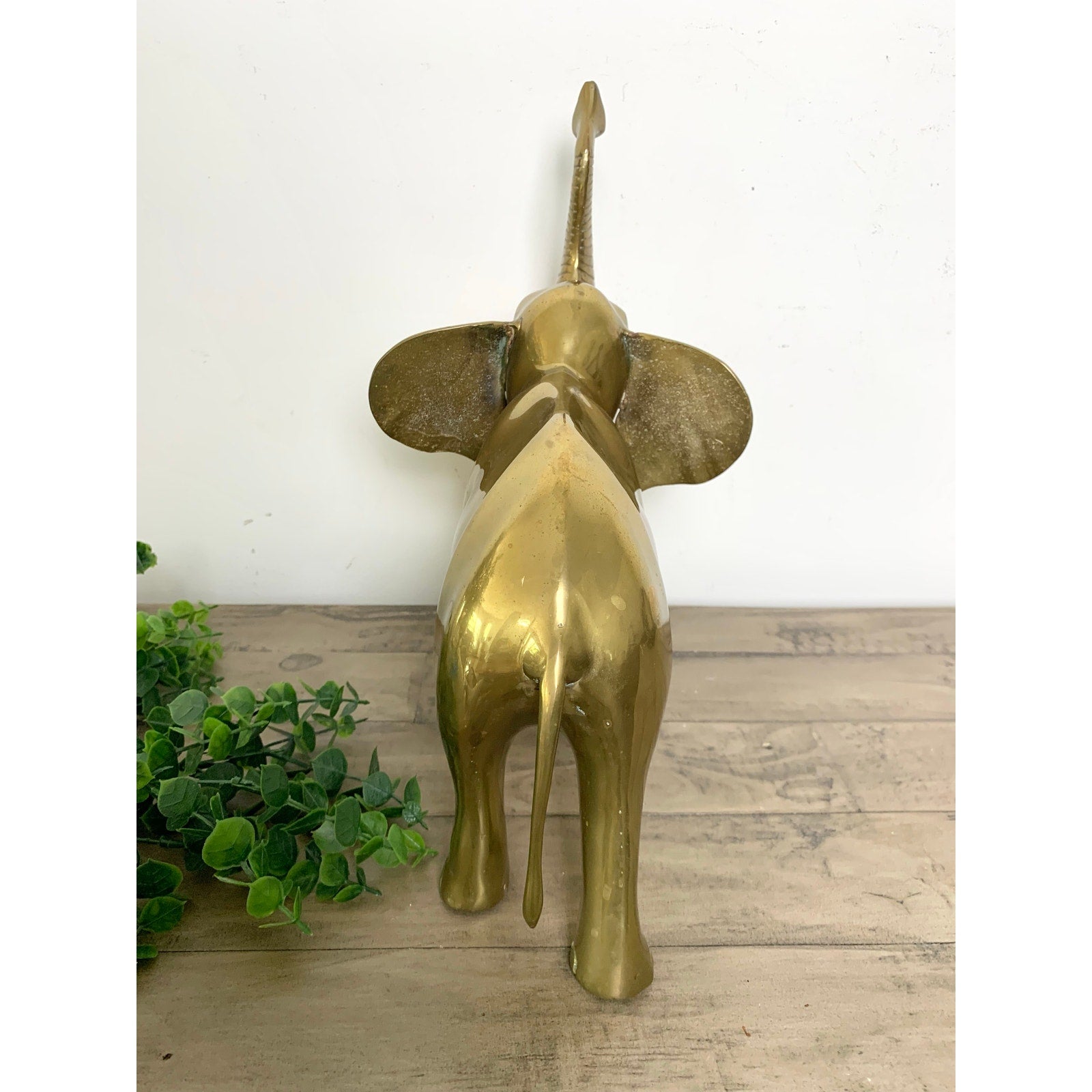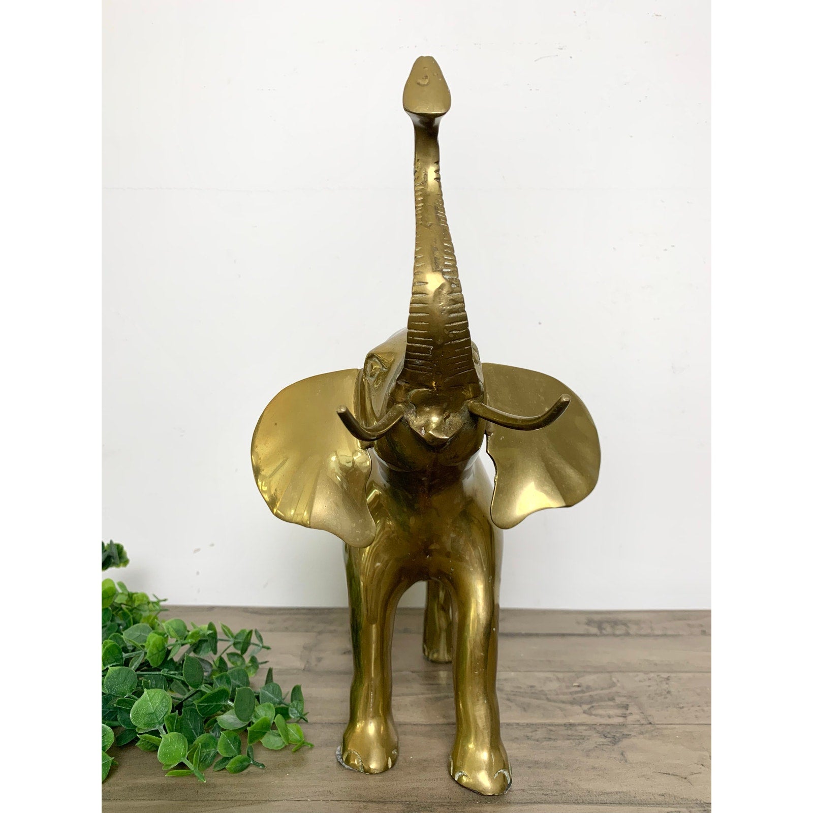 This striking large vintage brass elephant statue features a proud stance with its trunk raised high, symbolizing luck and prosperity. Crafted from solid brass, the piece has a bold presence and warm golden tone that makes it a beautiful focal point for any room. Perfect for mid century, eclectic, or safari-inspired interiors, this elephant adds both charm and elegance to your decor. It is substantial in size and weight, making it an eye-catching display on a shelf, console, or entryway. **Patina and light wear reflective of vintage age is present