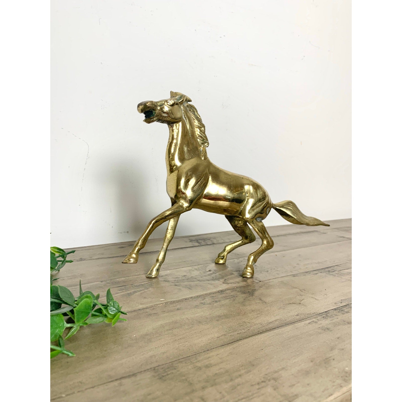 This vintage solid brass horse figurine features a beautifully detailed stallion in motion, showcasing strong musculature, flowing mane, and a proud stance. Crafted with mid-century elegance, the polished brass finish brings a warm, classic glow that complements both traditional and eclectic interiors.