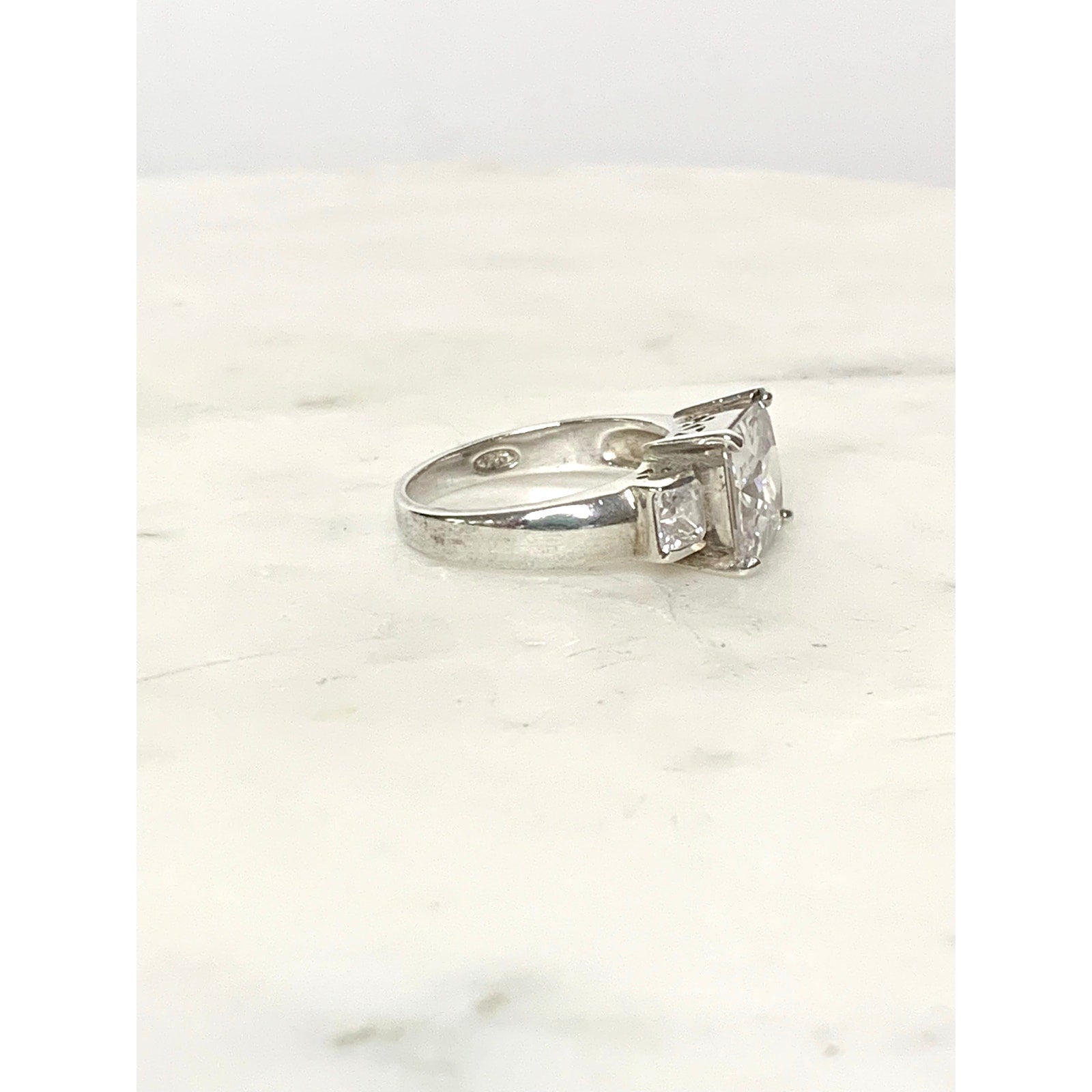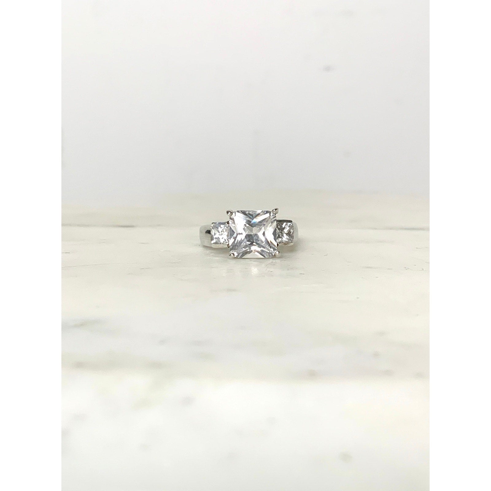 This sparkling vintage sterling silver ring features a brilliant princess-cut cubic zirconia center stone flanked by two smaller side stones, creating a timeless three-stone design. The cubic zirconia stones catch the light beautifully, offering the look of fine diamond jewelry at an accessible price. The ring is stamped 925 for sterling silver authenticity and has a classic band with delicate cutout details along the setting. Perfect as a statement piece, promise ring, or elegant everyday accessory.