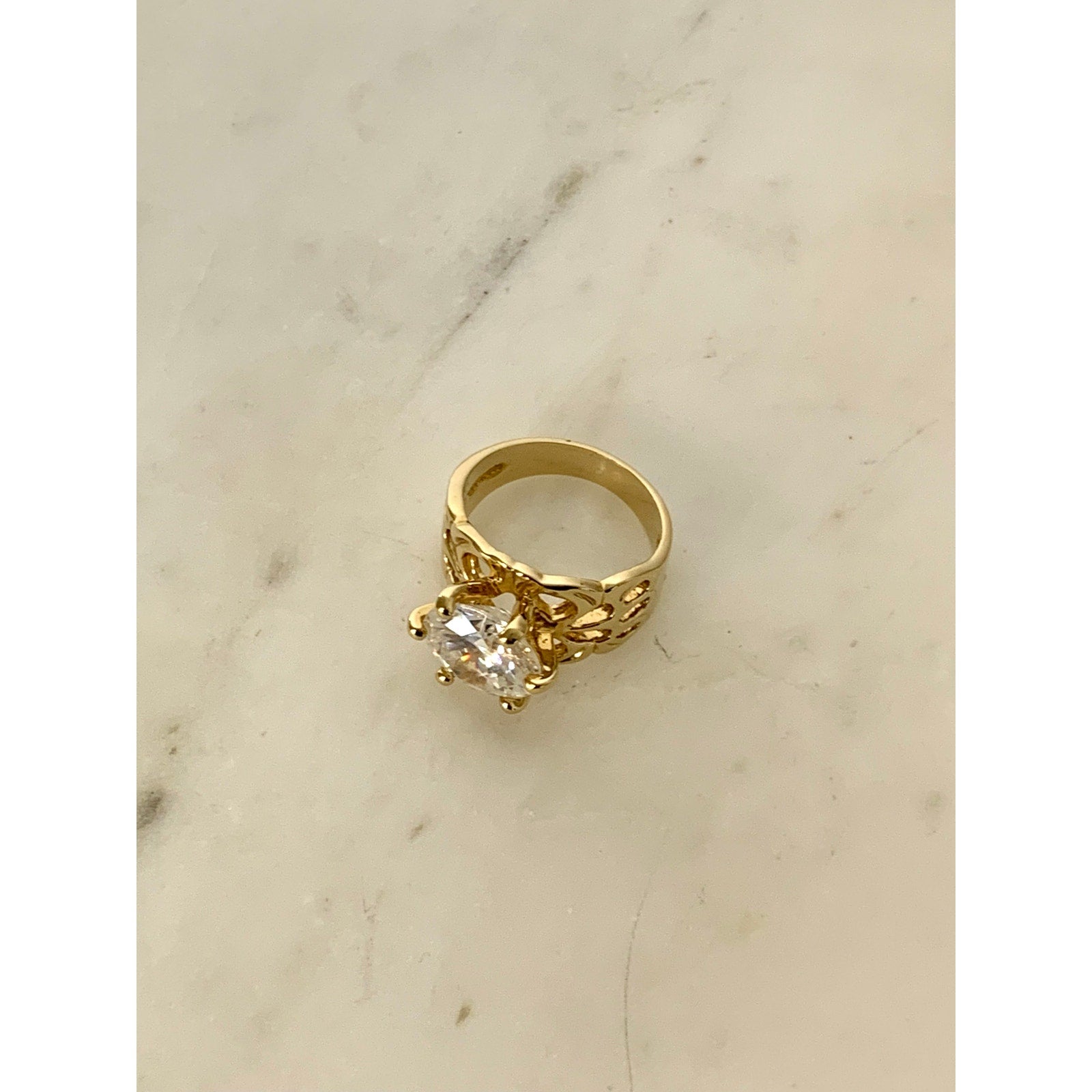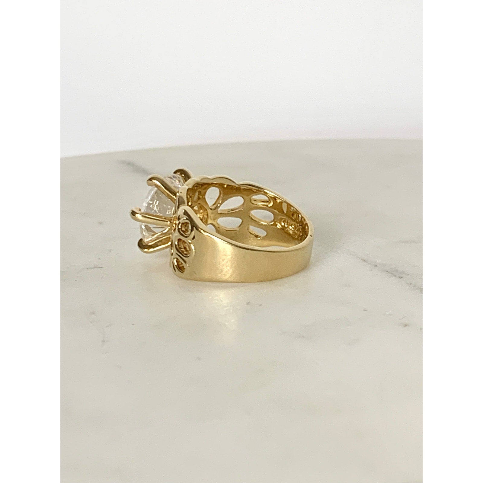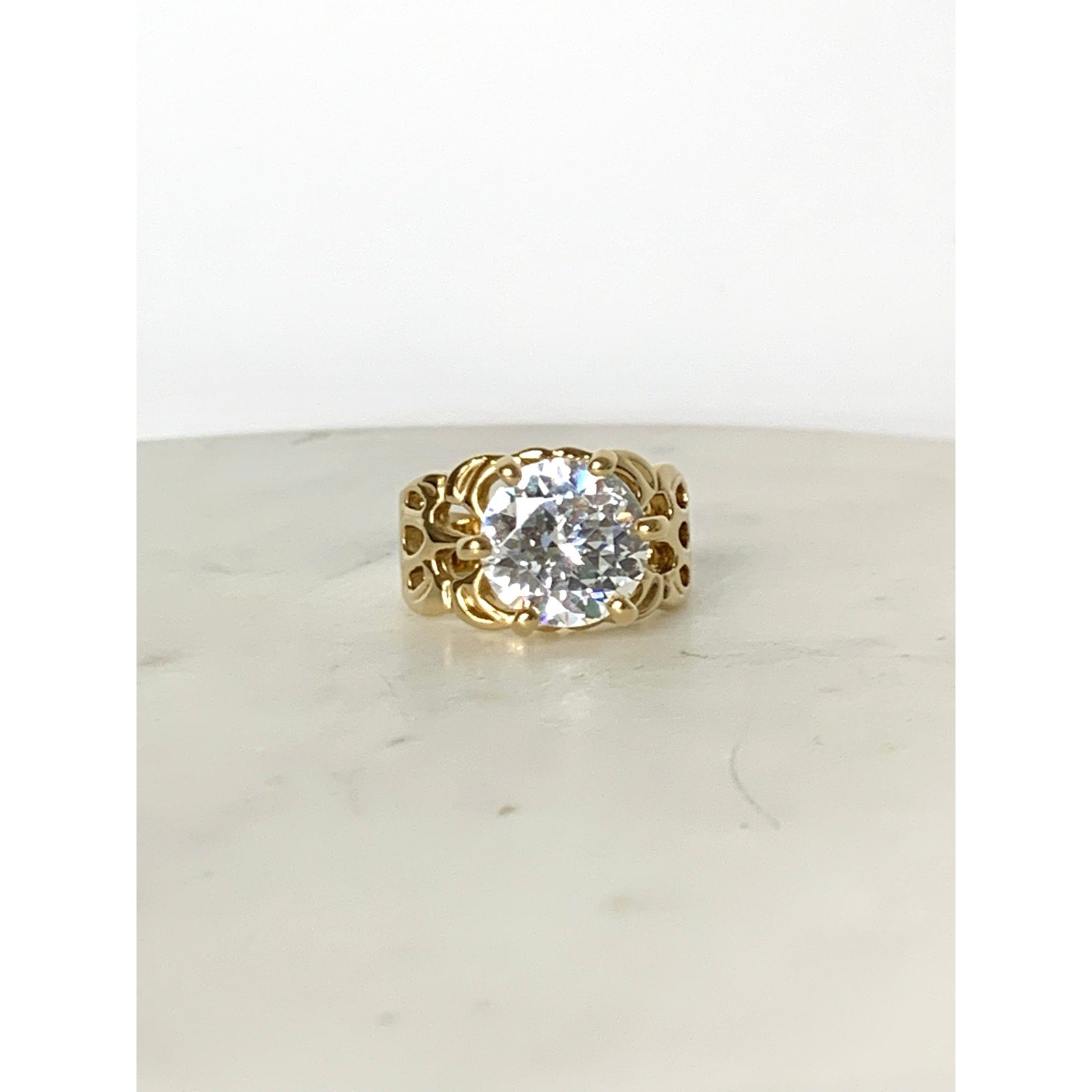 This dazzling vintage Uncas sterling silver ring features a bold round-cut cubic zirconia set in gleaming gold vermeil. The openwork filigree-style band adds a romantic, sculptural touch, balancing elegance with a powerful statement presence. Crafted in Thailand and marked Uncas 925, this ring reflects the quality and artistry the brand is known for.