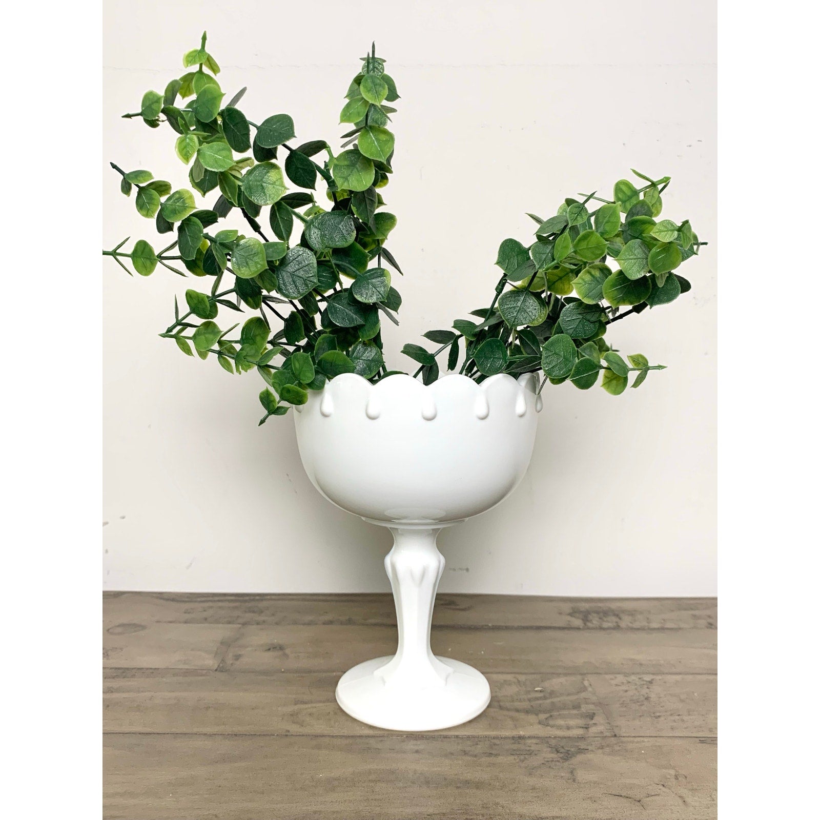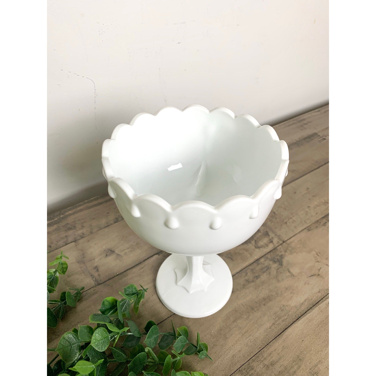 This elegant vintage milk glass pedestal compote features a scalloped edge with teardrop details and a graceful stemmed base. A timeless piece, it can be used as a candy dish, fruit bowl, centerpiece, or decorative accent for any room. The crisp white milk glass makes it versatile for farmhouse, cottage, or classic interiors, while the pedestal design adds height and charm to displays. Would also make a great candle vessel and wedding decor!
